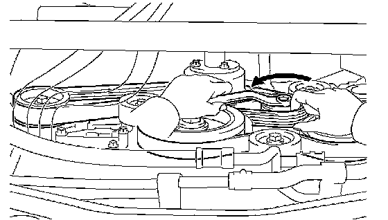 (2) While releasing the belt tension by turning the belt tensioner counterclockwise, put the V-ribbed belt on the P/S pump.
