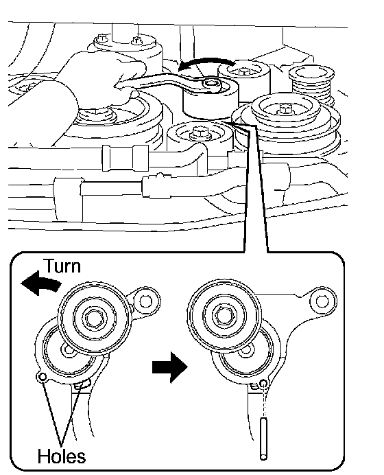 a. While turning the belt tensioner counterclockwise, align with its holes, and then insert a bar of 6 mm (0.24 inch) into the holes to fix the belt tensioner.
