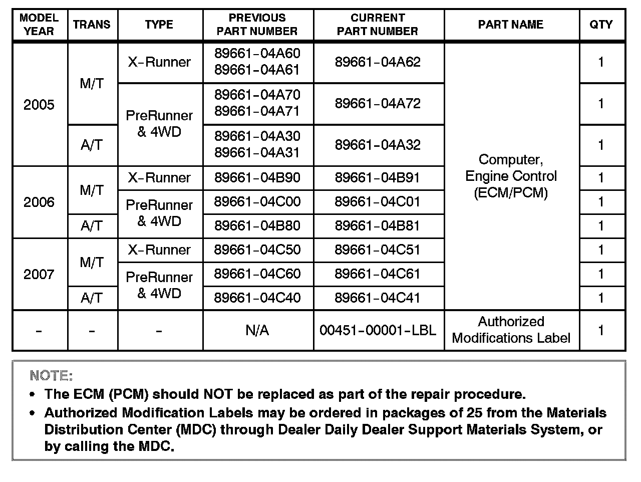 Some 2005 - 2007 model year Tacoma vehicles equipped with a 1GR-FE engine may exhibit an intermittent ~no start" condition. Improvements have been made to the Engine Control Module/ECM (SAE term: Powertrain Control Module/PCM) calibration to reduce the possibility of this condition occurring. Please use the following procedure to update the calibration.