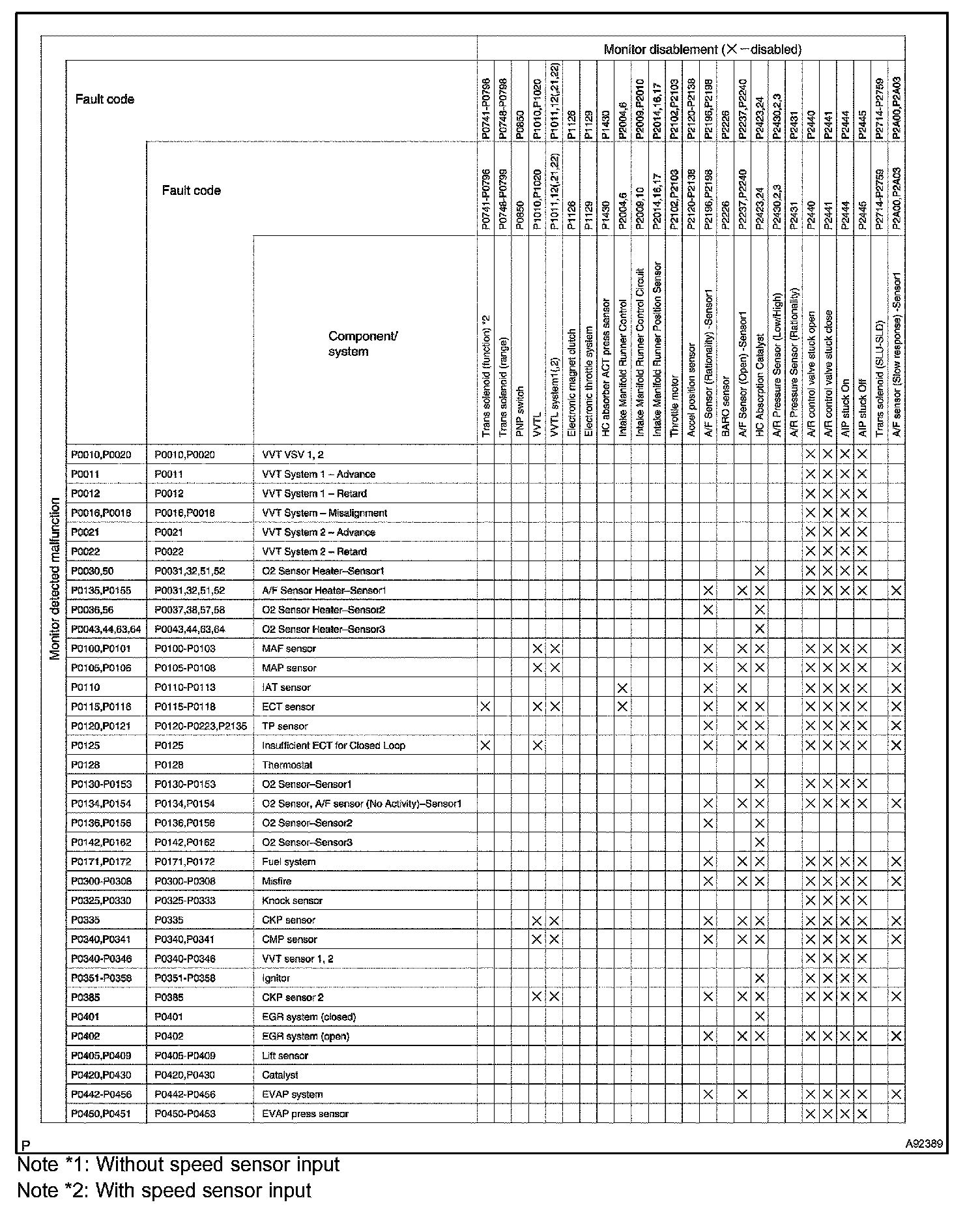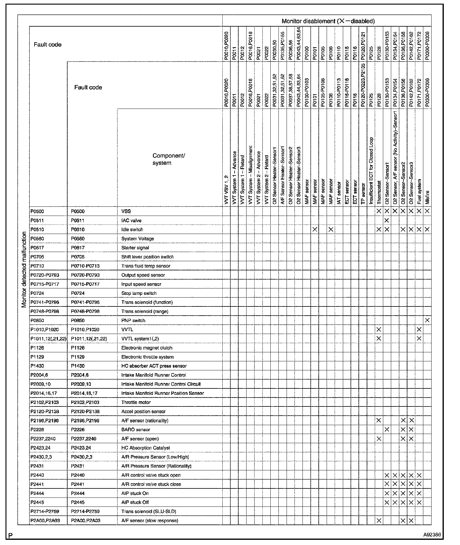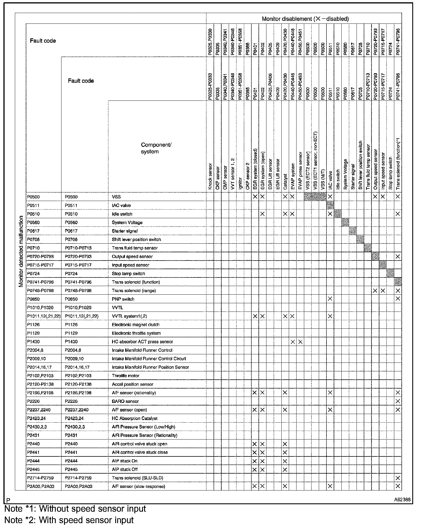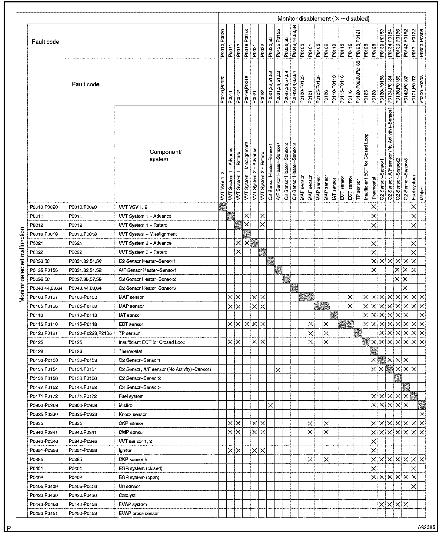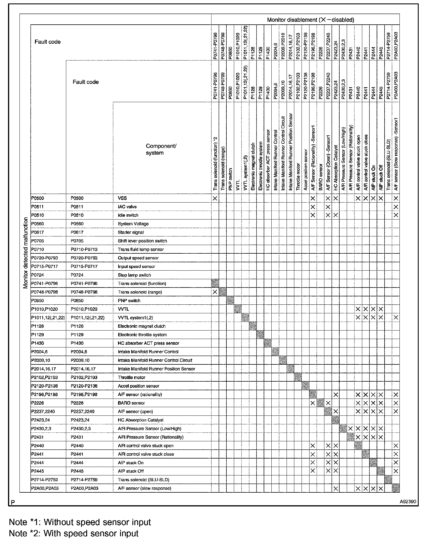"X" indicates that when the DTC on the left is stored, detection of the DTC in the upper column is not performed.