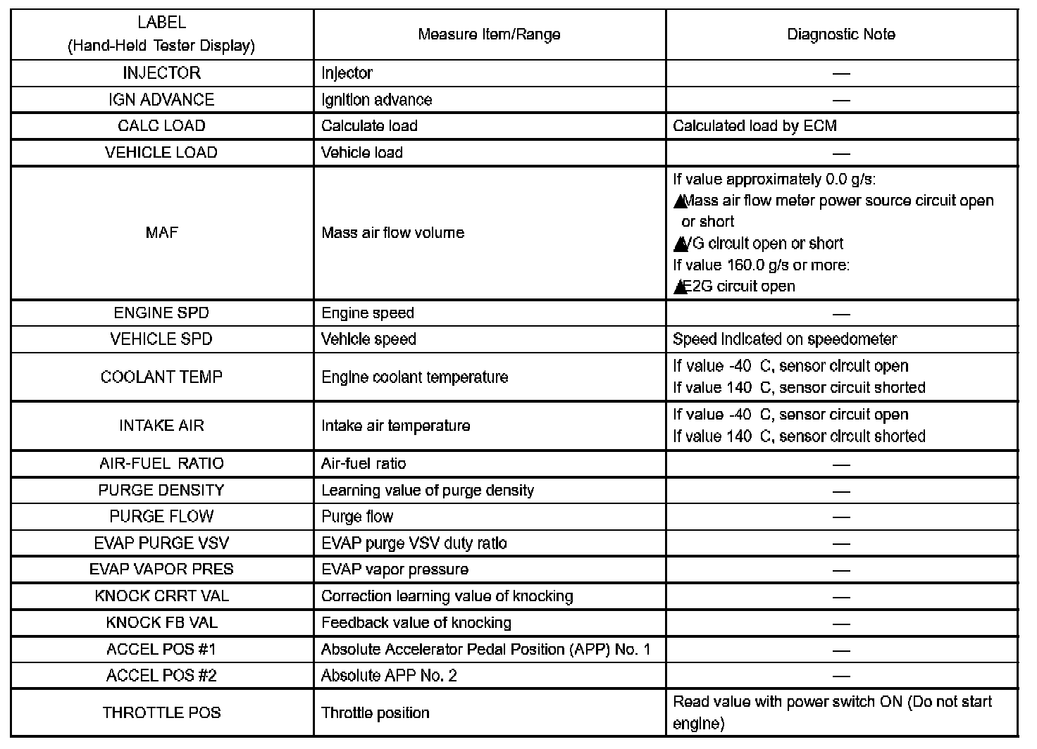 Freeze frame data record the engine conditions (fuel system, calculated load, engine coolant temperature, fuel trim, engine speed, vehicle speed, etc.) when a malfunction is detected. When troubleshooting, it can help determine if the vehicle was running or stopped, the engine was warmed up or not, the air-fuel ratio was LEAN or RICH, and other data, from the time the malfunction occurred.