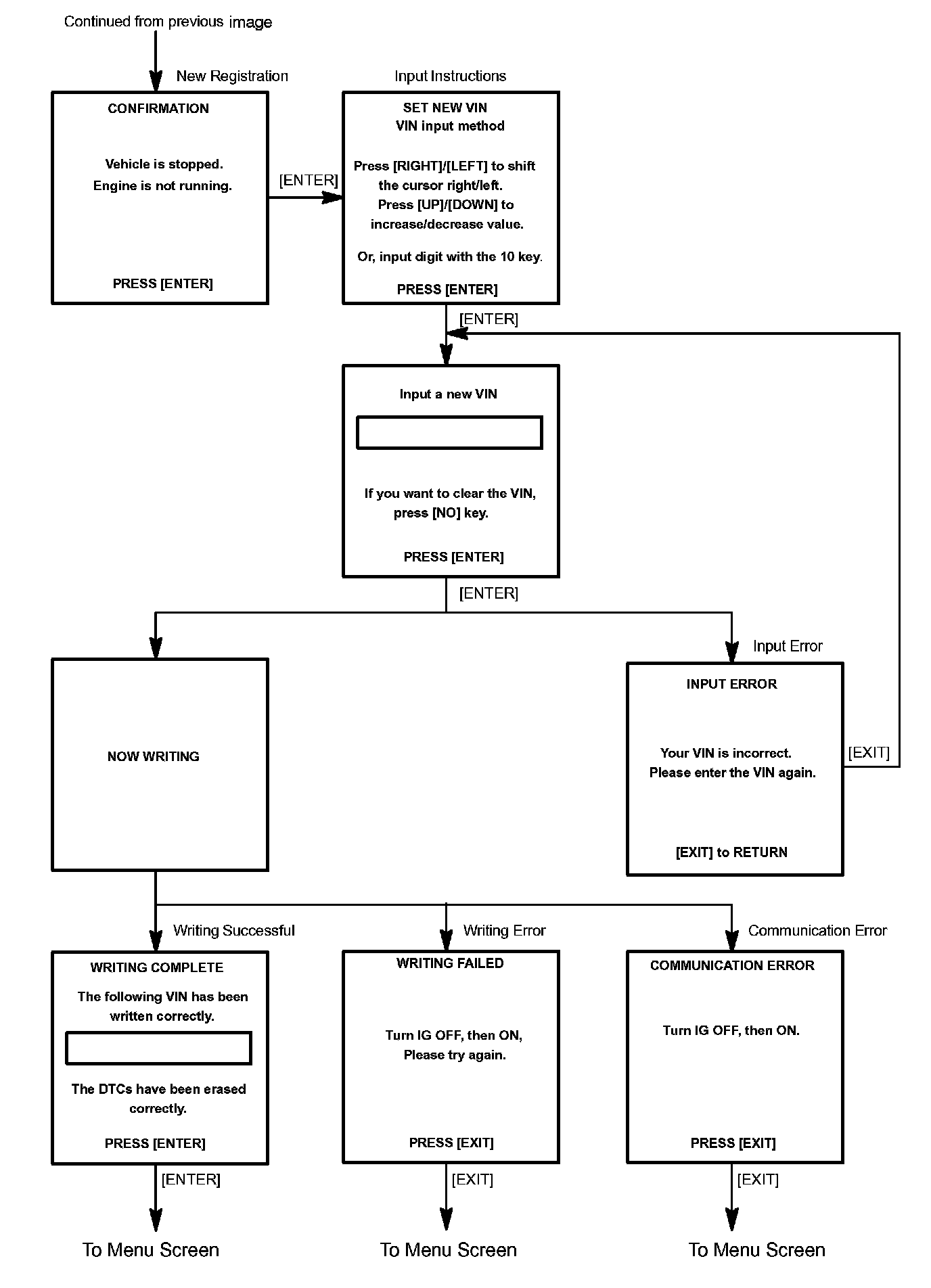 c. Write VIN: Explains the VIN writing process in a flowchart. This process allows the VIN to be input into the ECM. If the ECM is changed, or the VIN and VIN do not match, the VIN can be registered, or overwritten in the ECM by following this procedure.
