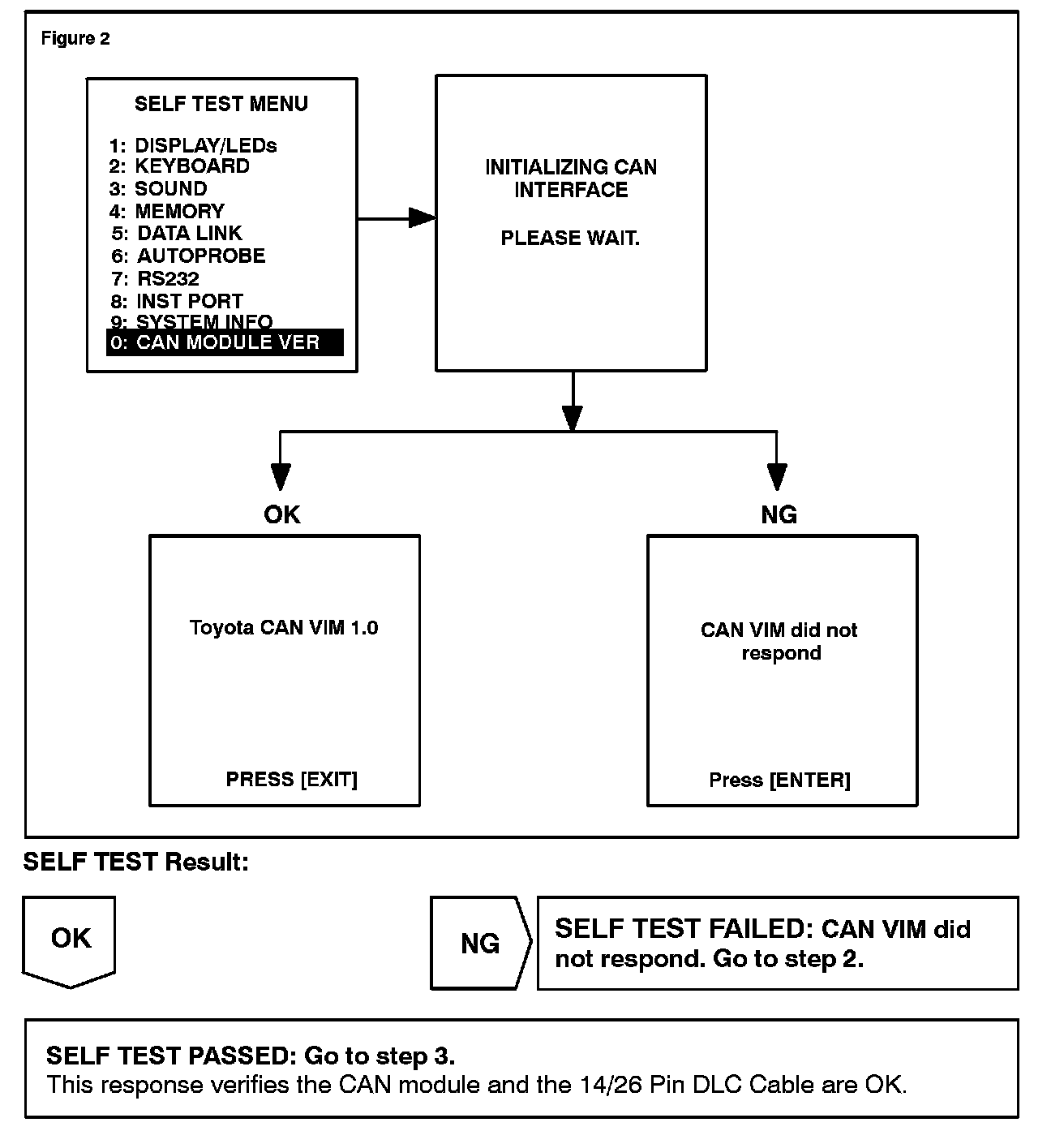 1. Using the Diagnostic Tester, perform the CAN MODULE VERSION self test. Select DIAGNOSIS/SETUP/SELF TEST and perform the following screen flow.