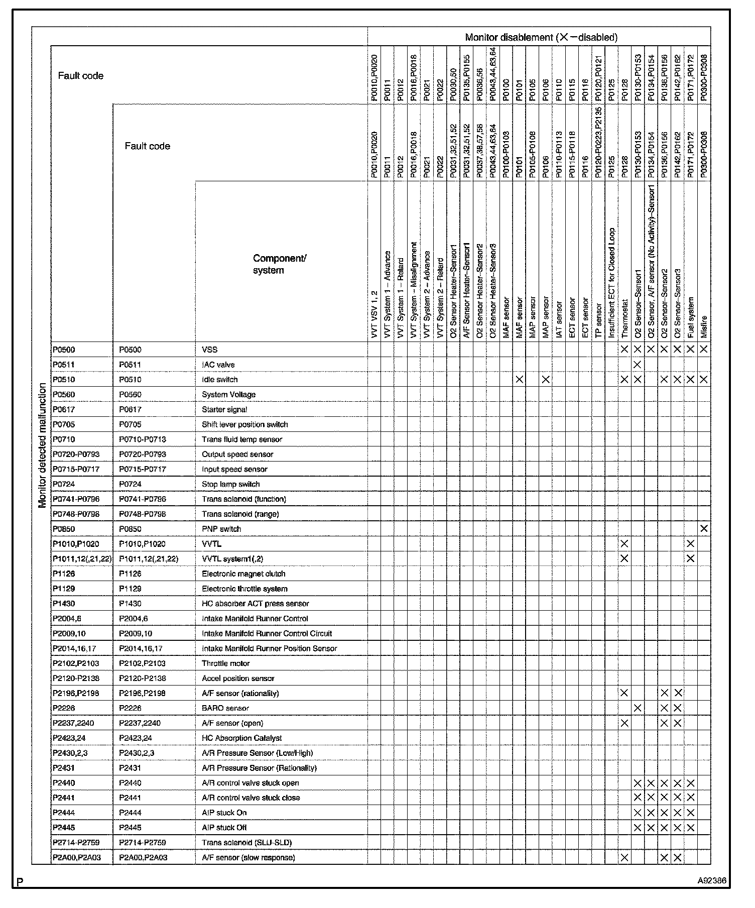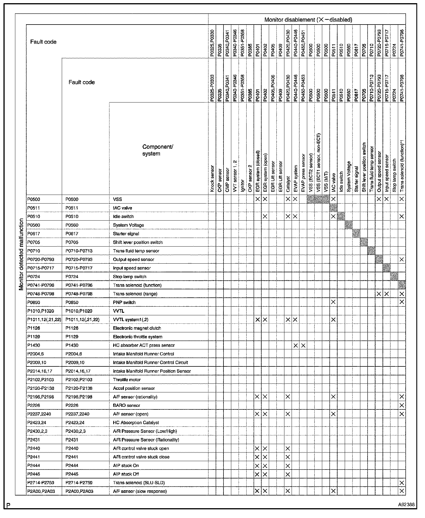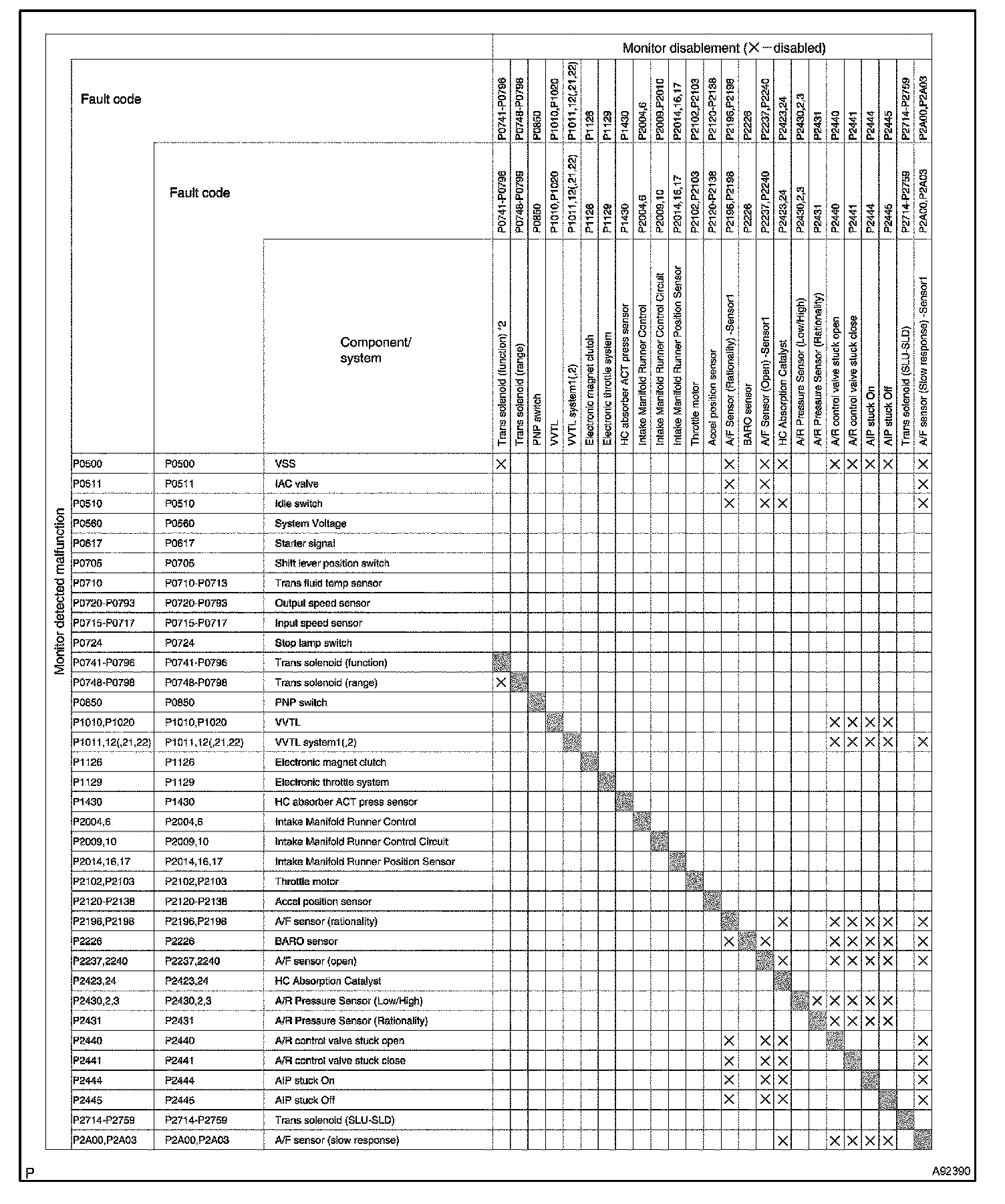"X" marks indicate that when the DTC on the left is stored, detection of the DTC in the upper column is not performed.