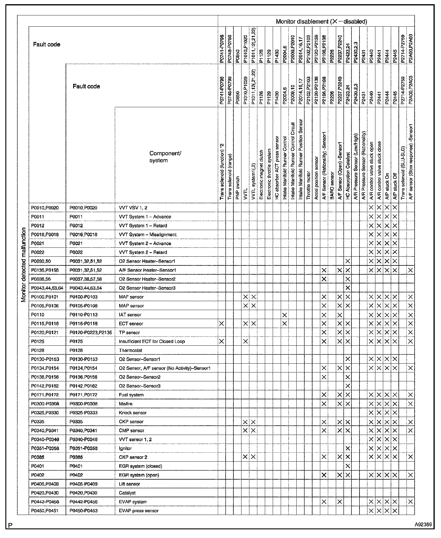HINT: This table indicates the ECM monitoring status for the items in the upper columns if the DTCs in each line on the left are set.
