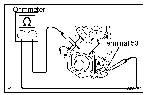 1. Using an ohmmeter, measure the resistance between terminal 50 and the switch body.