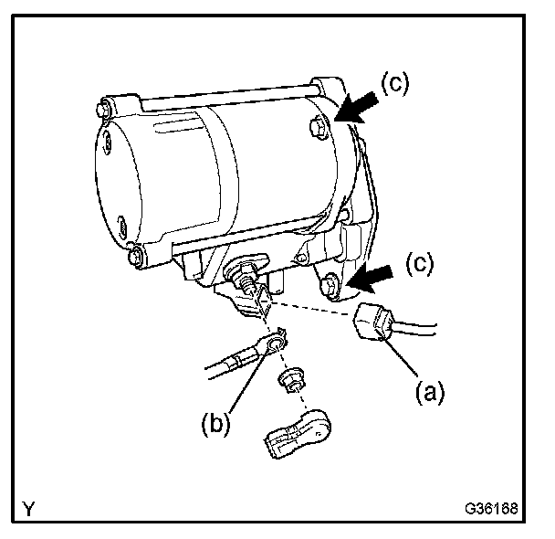 c. Remove the 2 bolts, then remove the starter assembly.