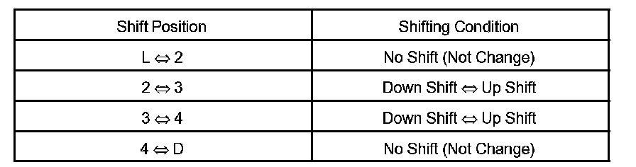 b. Drive with the transmission wire disconnected. Shift the shift lever to the L, 2, 3, 4 and D positions to check whether the shifting condition changes as shown in the table.