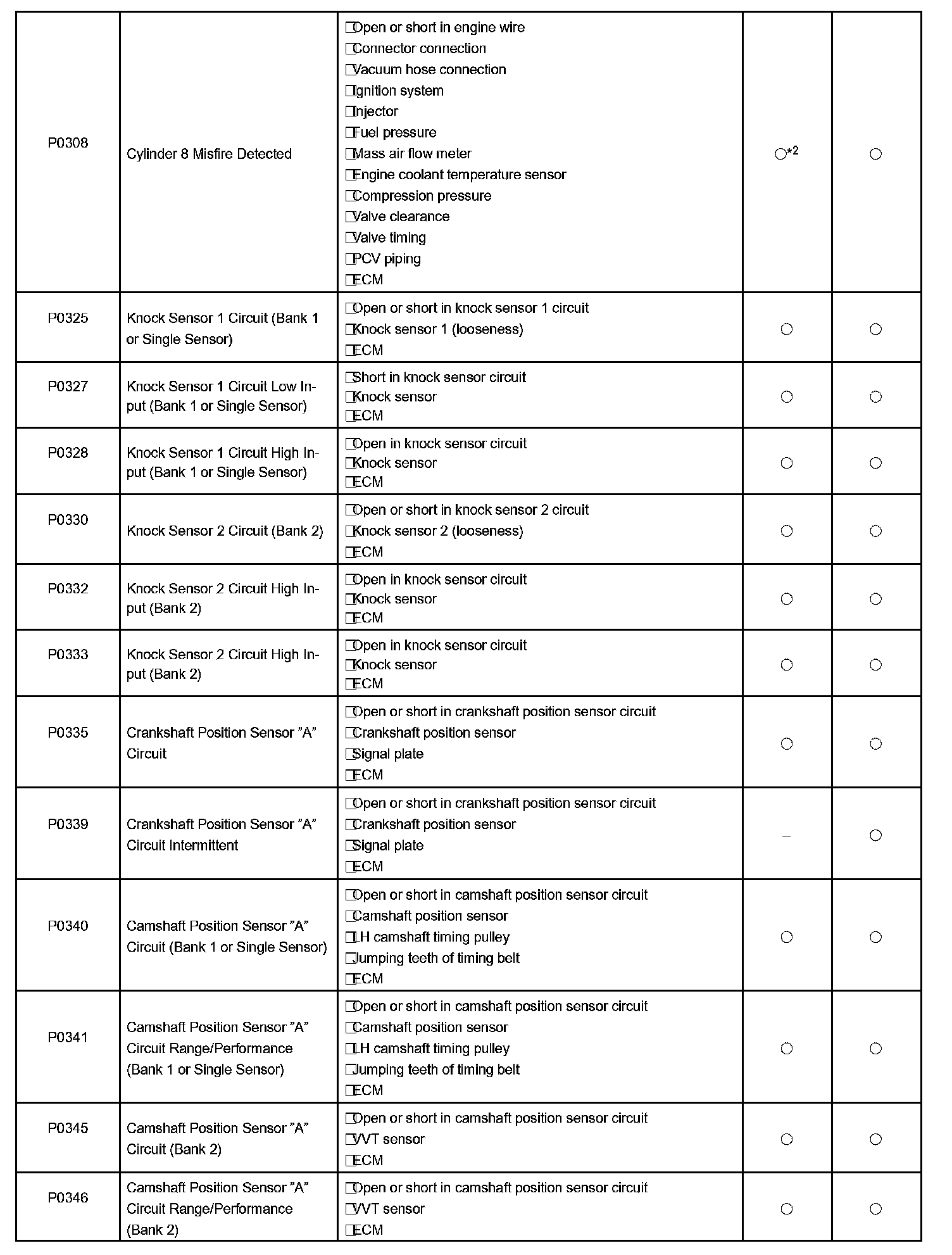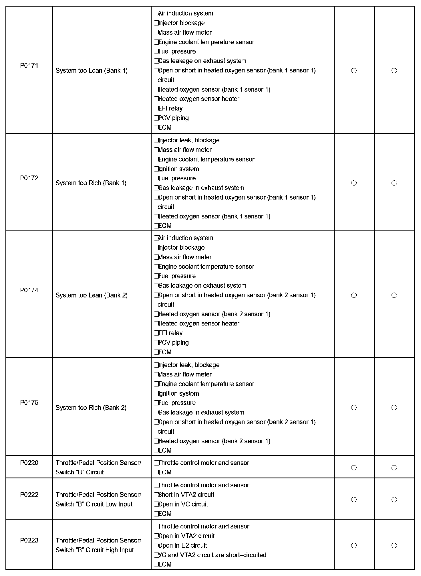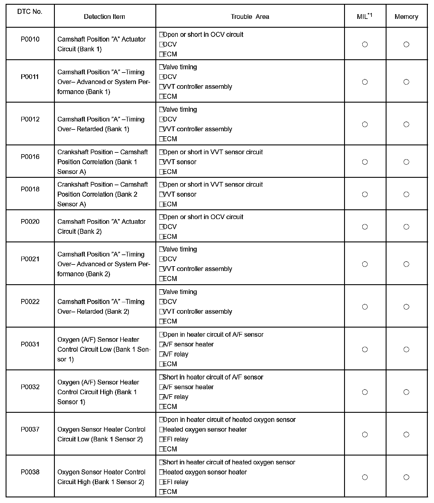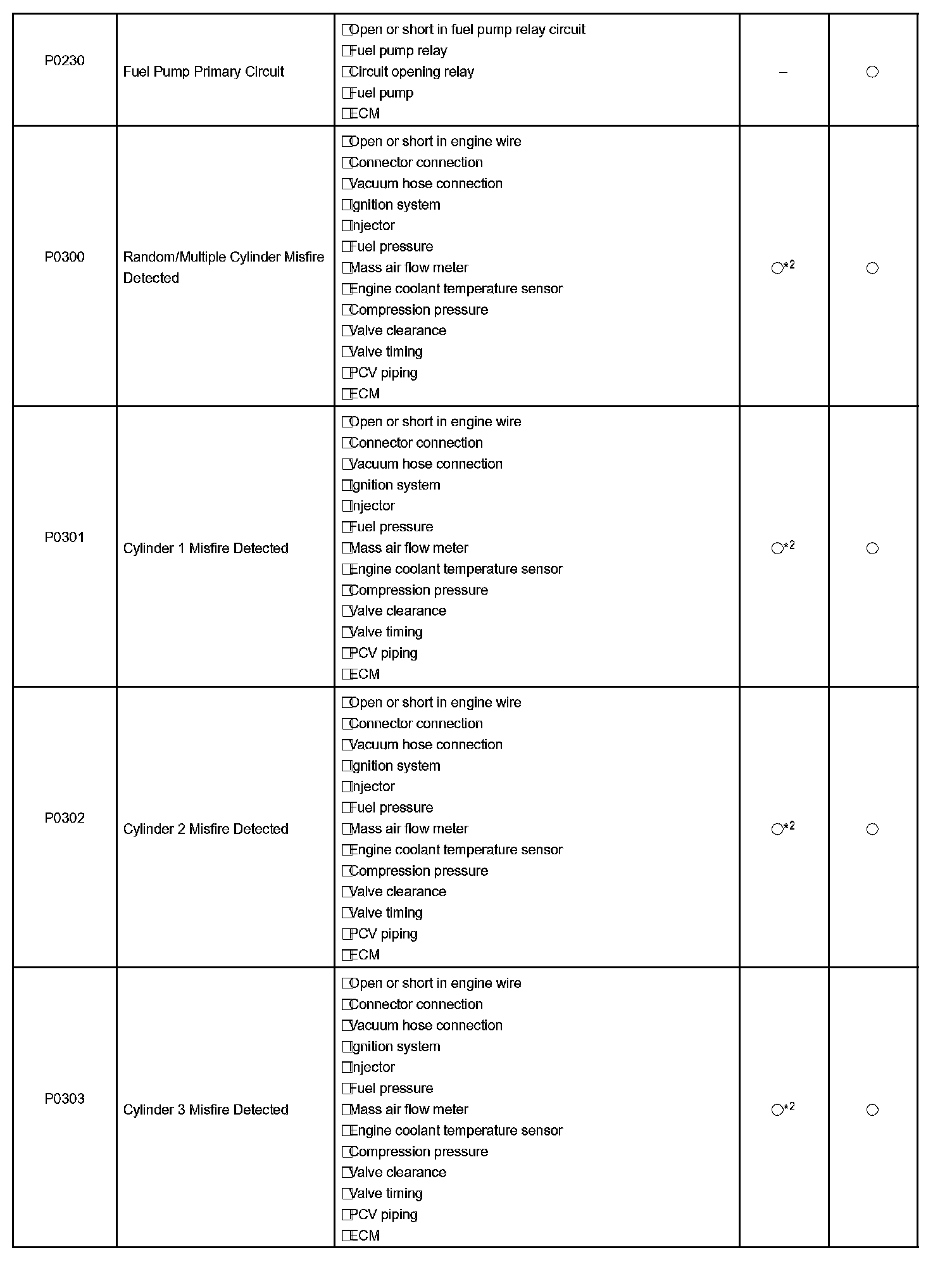 If a malfunction code is displayed during the DTC check in the check mode, check the circuit for the listed in the table. For details of each code, refer to the respective "DTC NO." in the DTC chart.