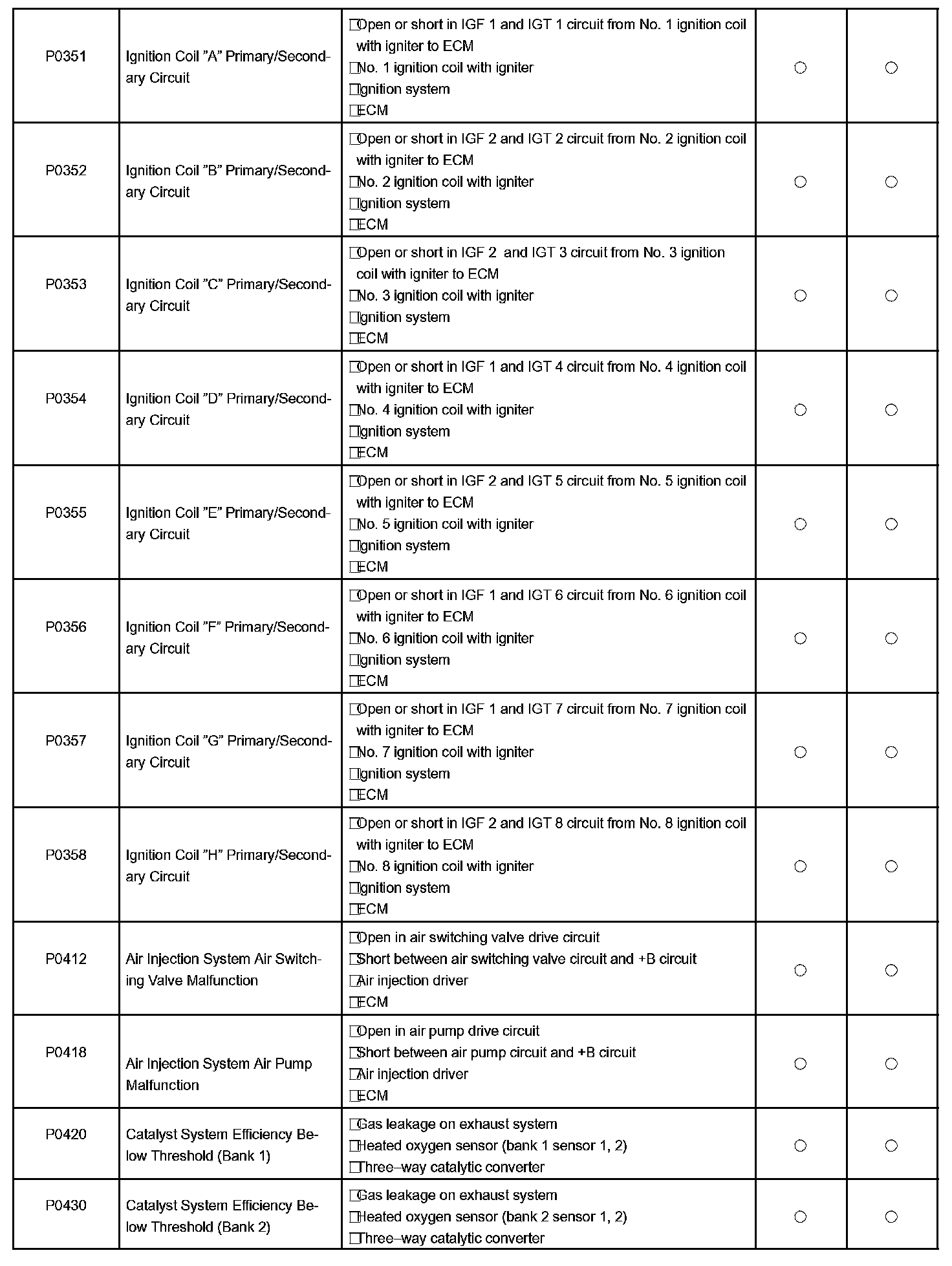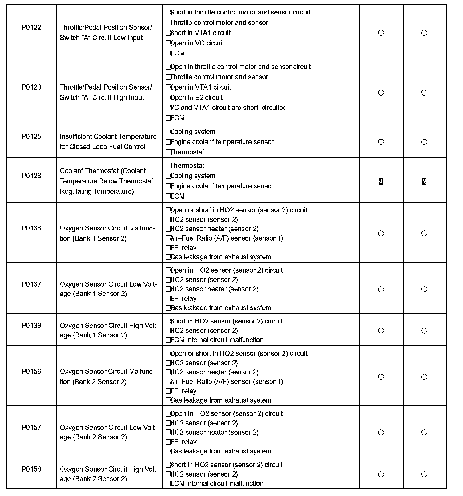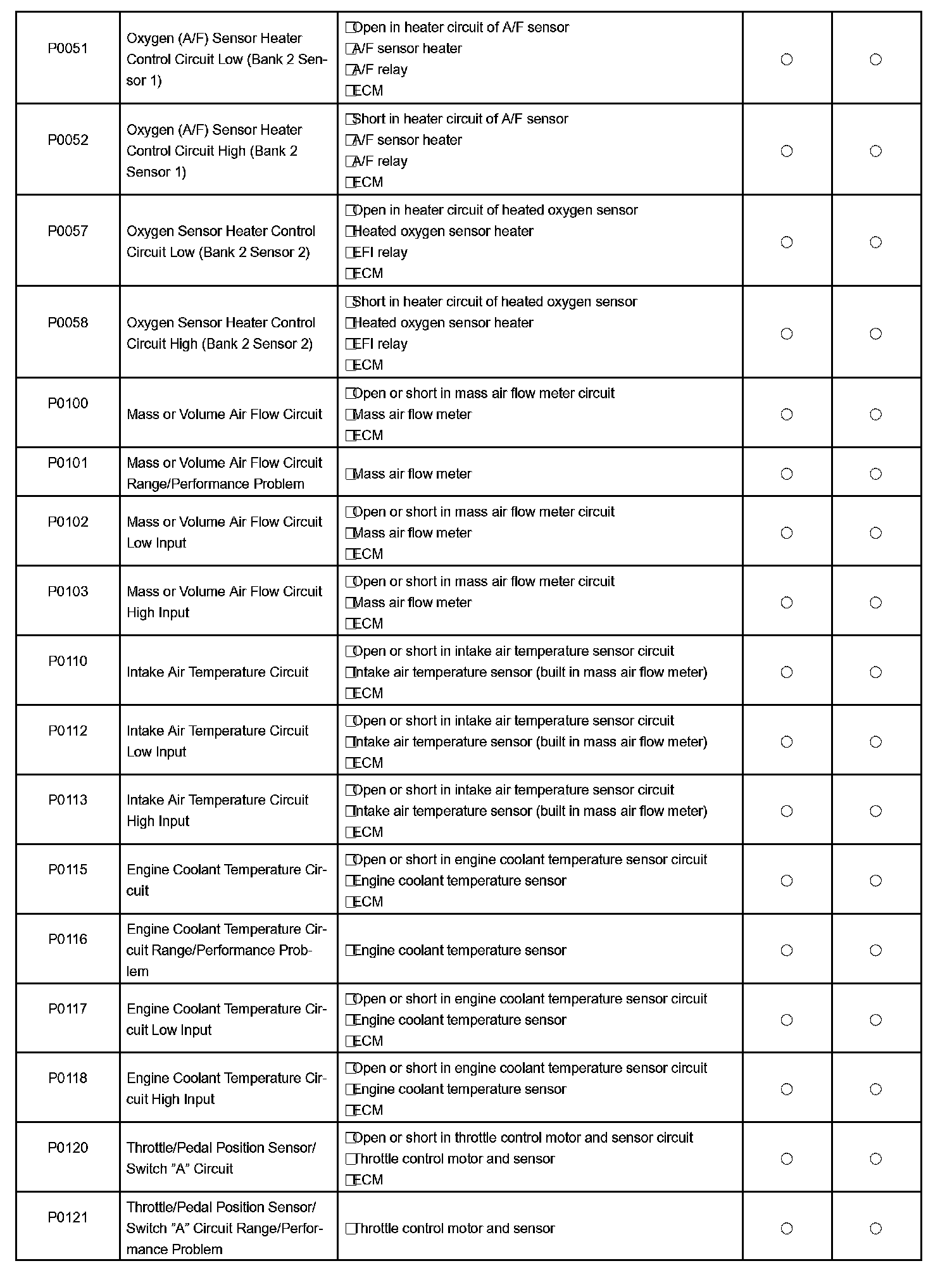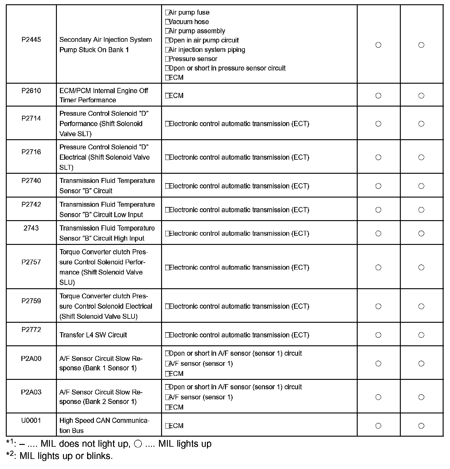 If a malfunction code is displayed during the DTC check in the check mode, check the circuit for the listed in the table. For details of each code, refer to the respective "DTC NO." in the DTC chart.