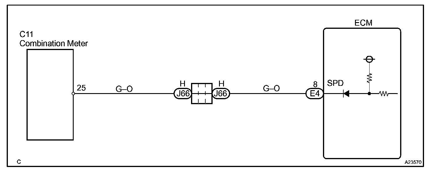 The No.1 vehicle speed sensor outputs a 4-pulse signal for every revolution of the rotor shaft, which is rotated by the transmission output shaft via the driven gear. After this signal is converted into a more precise rectangular waveform by the waveform shaping circuit inside the combination meter, it is then transmitted to the ECM. The ECM determines the vehicle speed based on the frequency of these pulse signals.