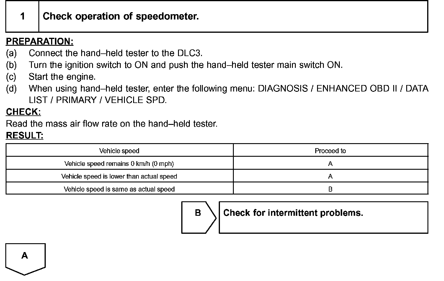 Inspect the vehicle's ECM using check mode. Intermittent problems are easier to detect with a hand-held tester when the ECM is in check mode. In check mode, the ECM uses 1trip detection logic, which is more sensitive to malfunctions than normal mode (default), which uses 2 trip detection logic.