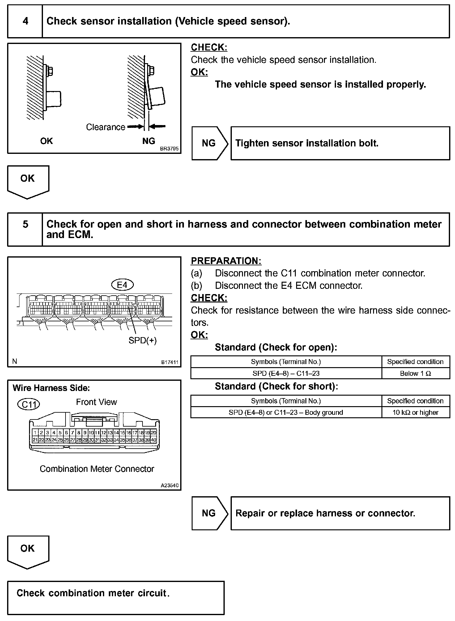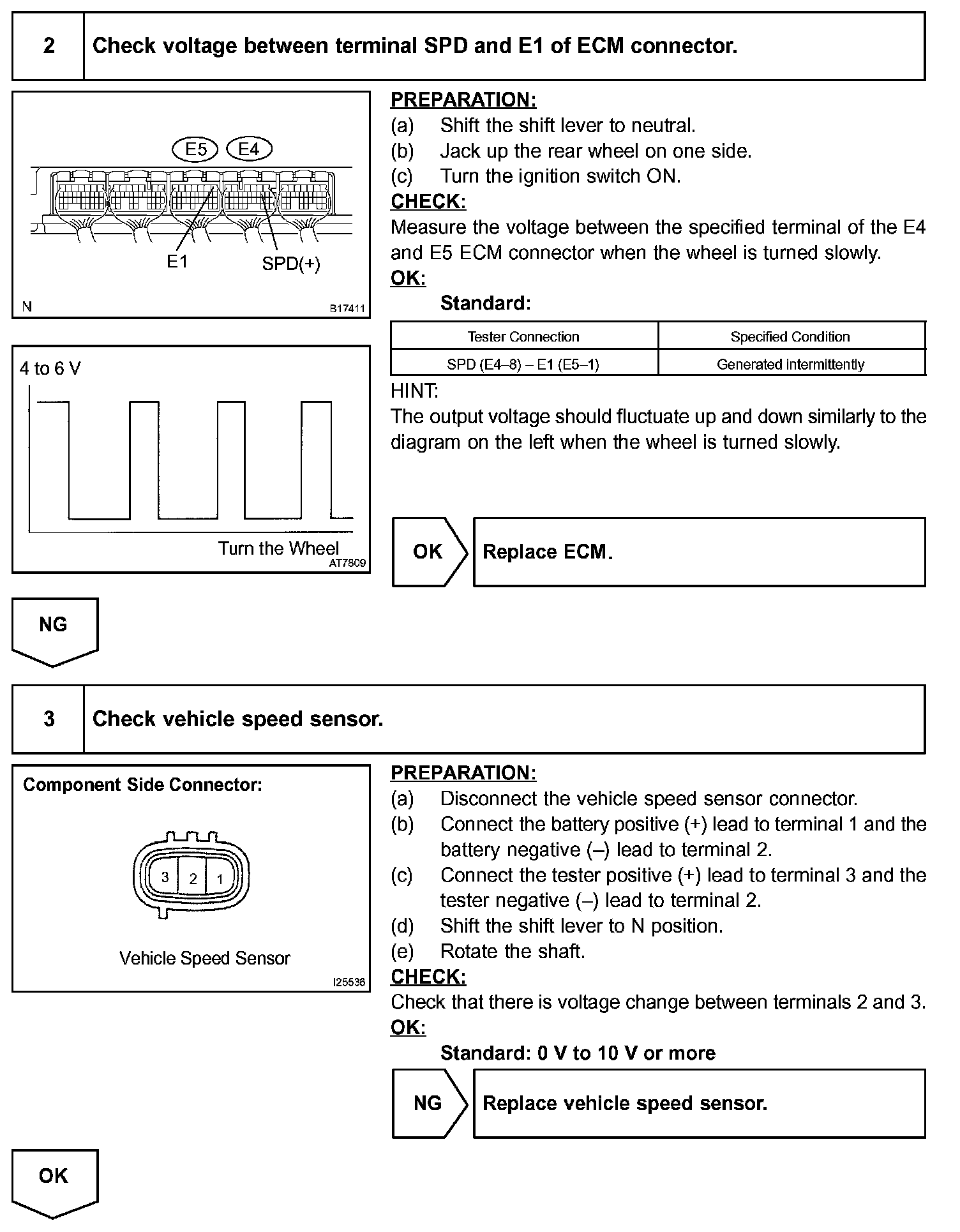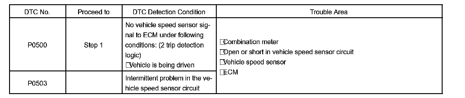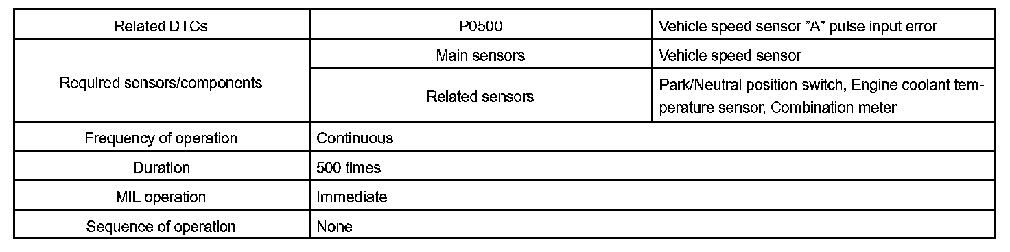 If there is no signal from the vehicle speed sensor when these conditions are satisfied, the ECM concludes that there is a fault in the vehicle speed sensor. The ECM will turn on the MIL and a DTC is set.