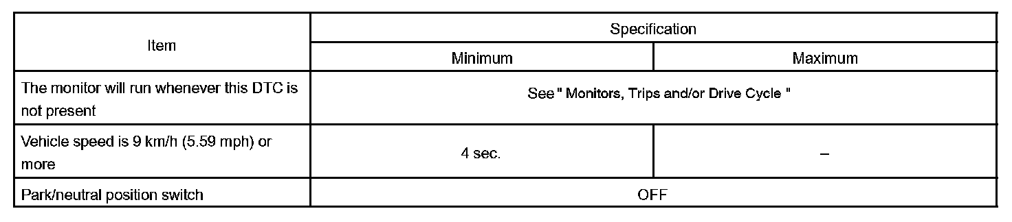 The ECM assumes that the vehicle is driven when the park/neutral position switch is OFF and it has been over 4 sec. since the actual vehicle speed was 9 km/h (6 mph) or more.