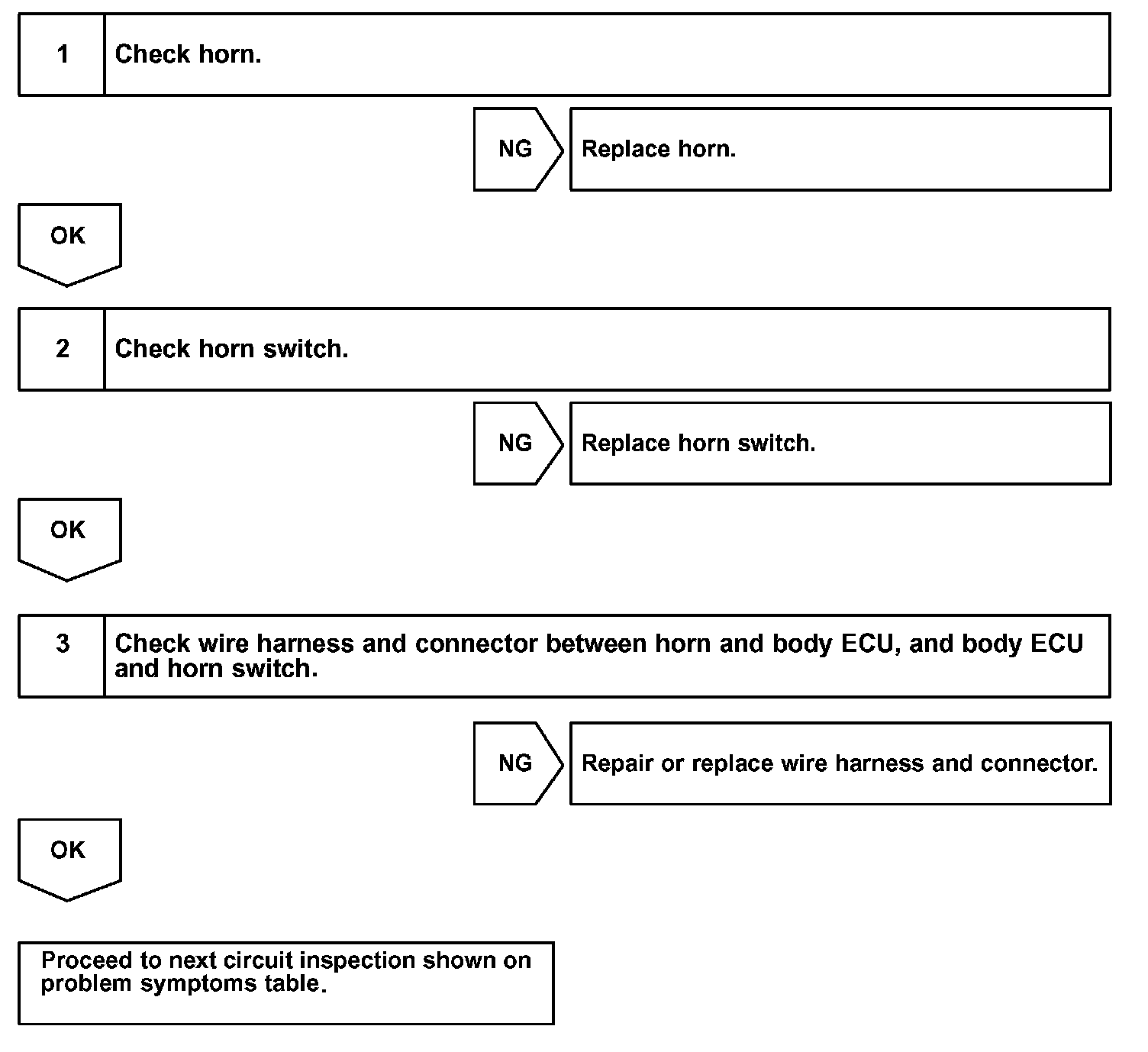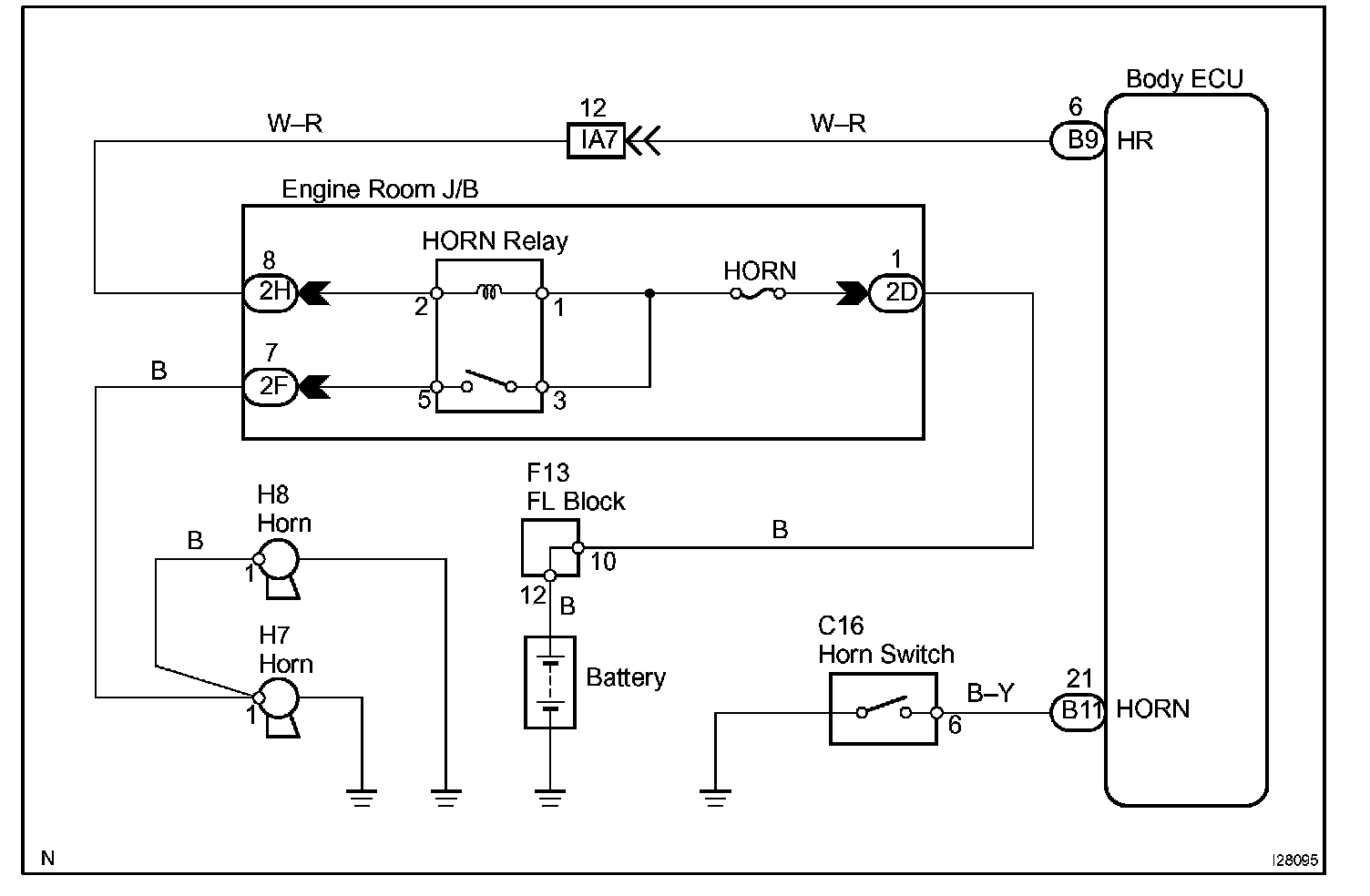 The horn is connected to the body ECU and activated by the body ECU during warning of the theft deterrent system horn switch is turned on.