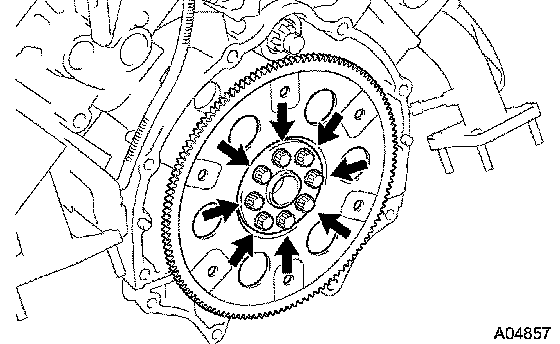 Remove the 8 bolts, front spacer, drive plate and rear spacer.