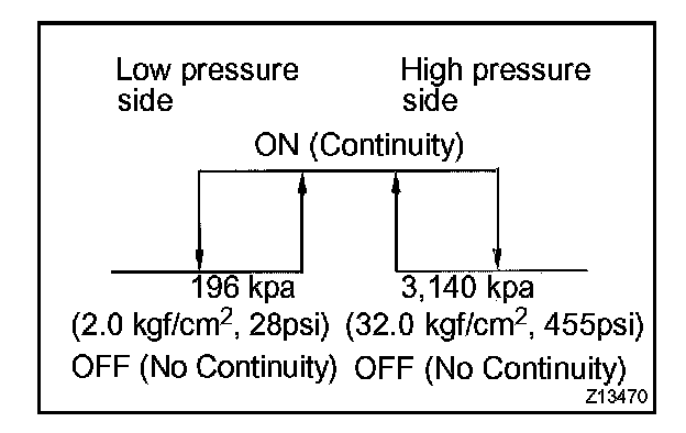 b. Check continuity between terminals when refrigerant pressure is changed, as shown in the illustration.