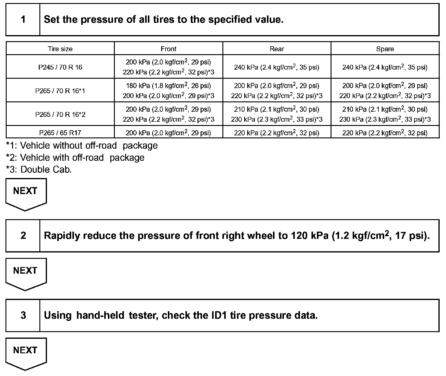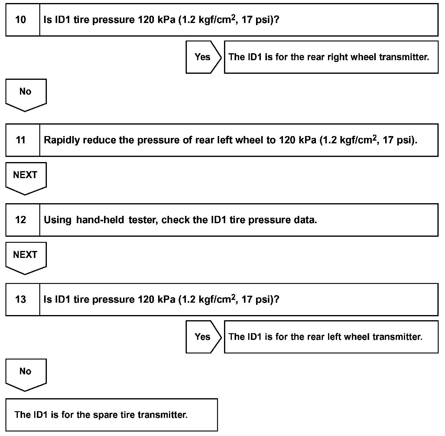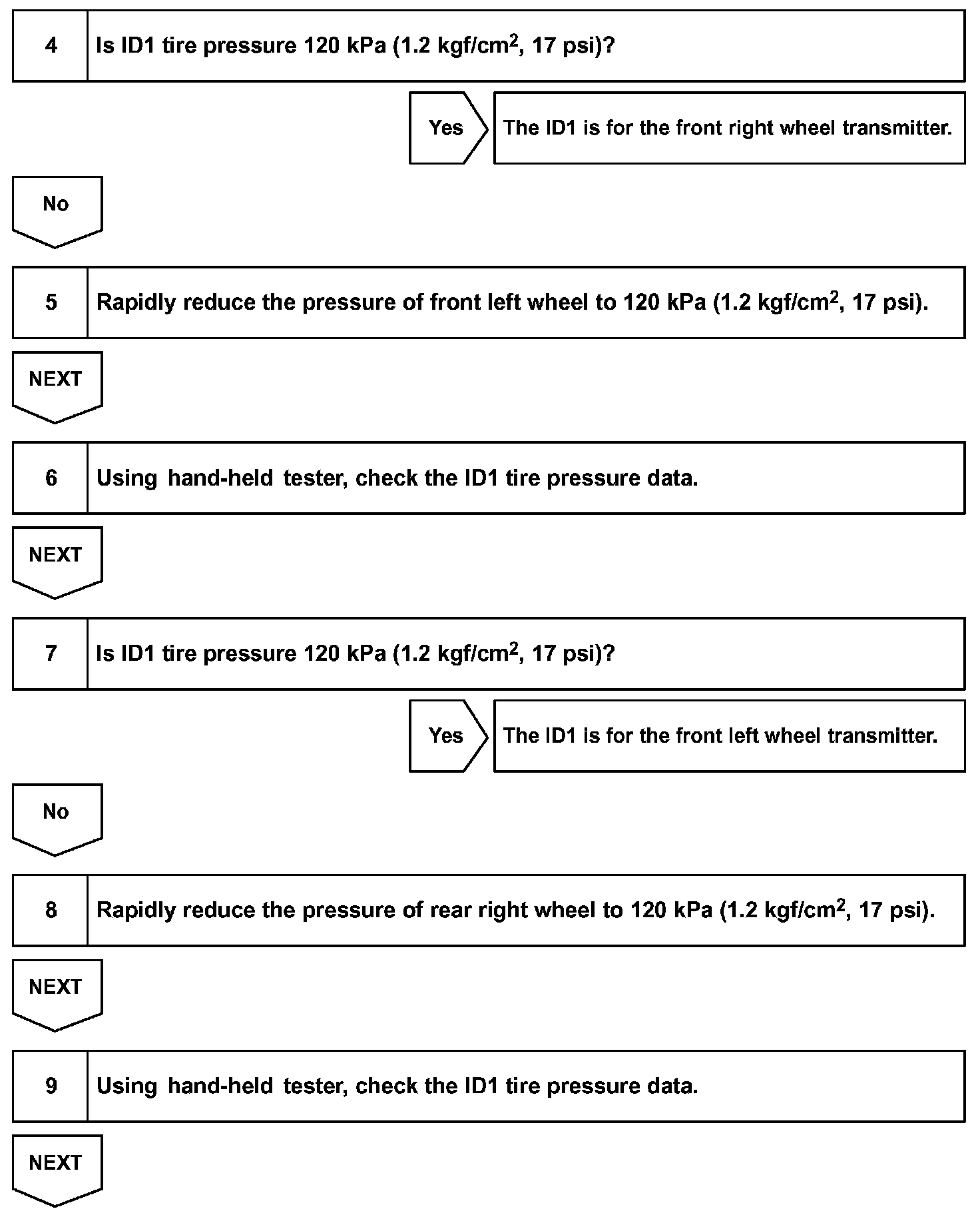 - DTCs relevant to the transmitters are corresponding to each transmitter ID. It is impossible to identify which tire is malfunctioning according to each transmitter ID. Therefore the following procedures must be followed to confirm the ID No. and tire location.