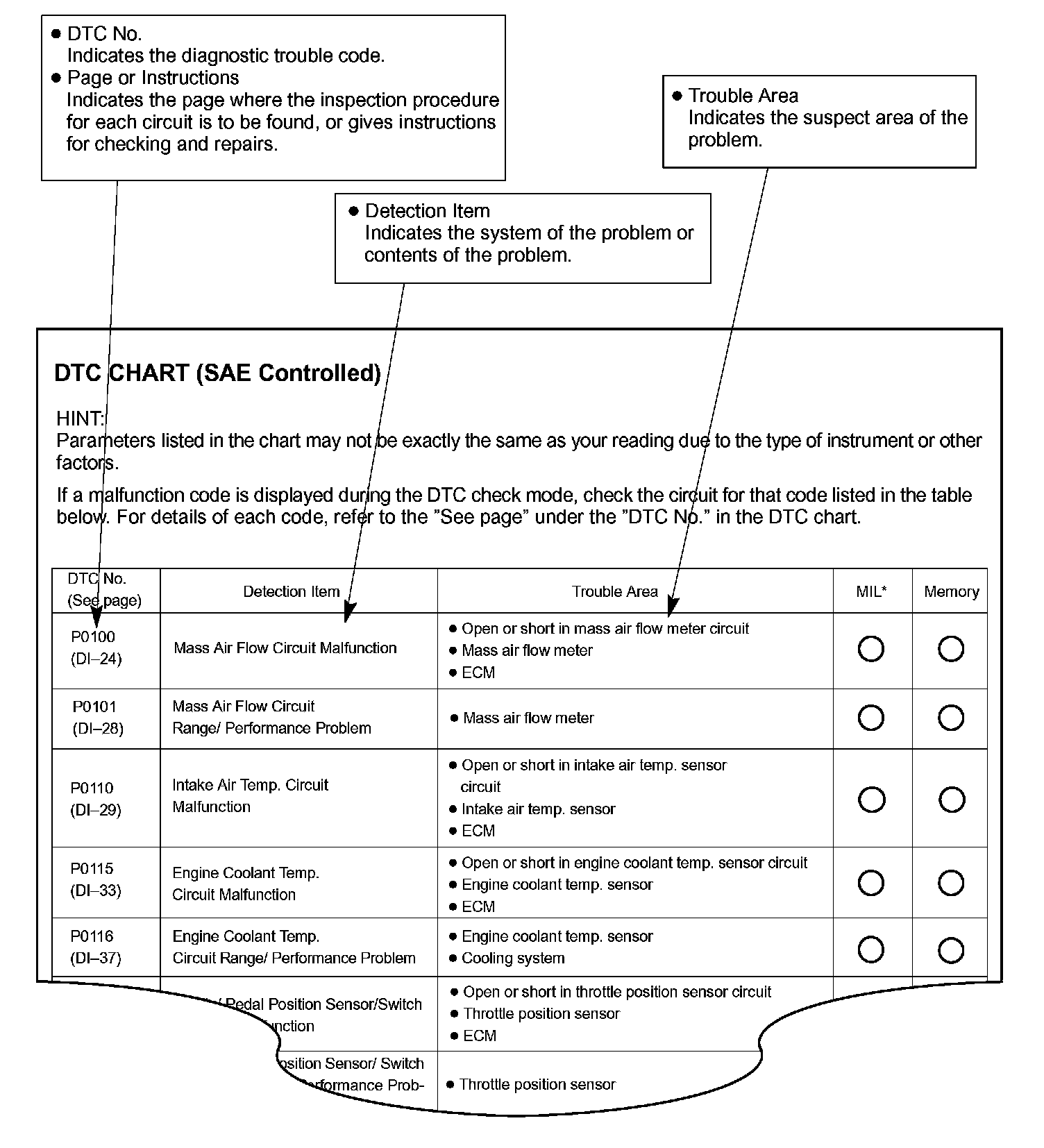 DIAGNOSTIC TROUBLE CODE CHARTUse Diagnostic Trouble Codes (DTCs) (from the DTC checks) in the table to determine the trouble area and proper inspection procedure. Engine diagnostic trouble code chart is shown as an example.