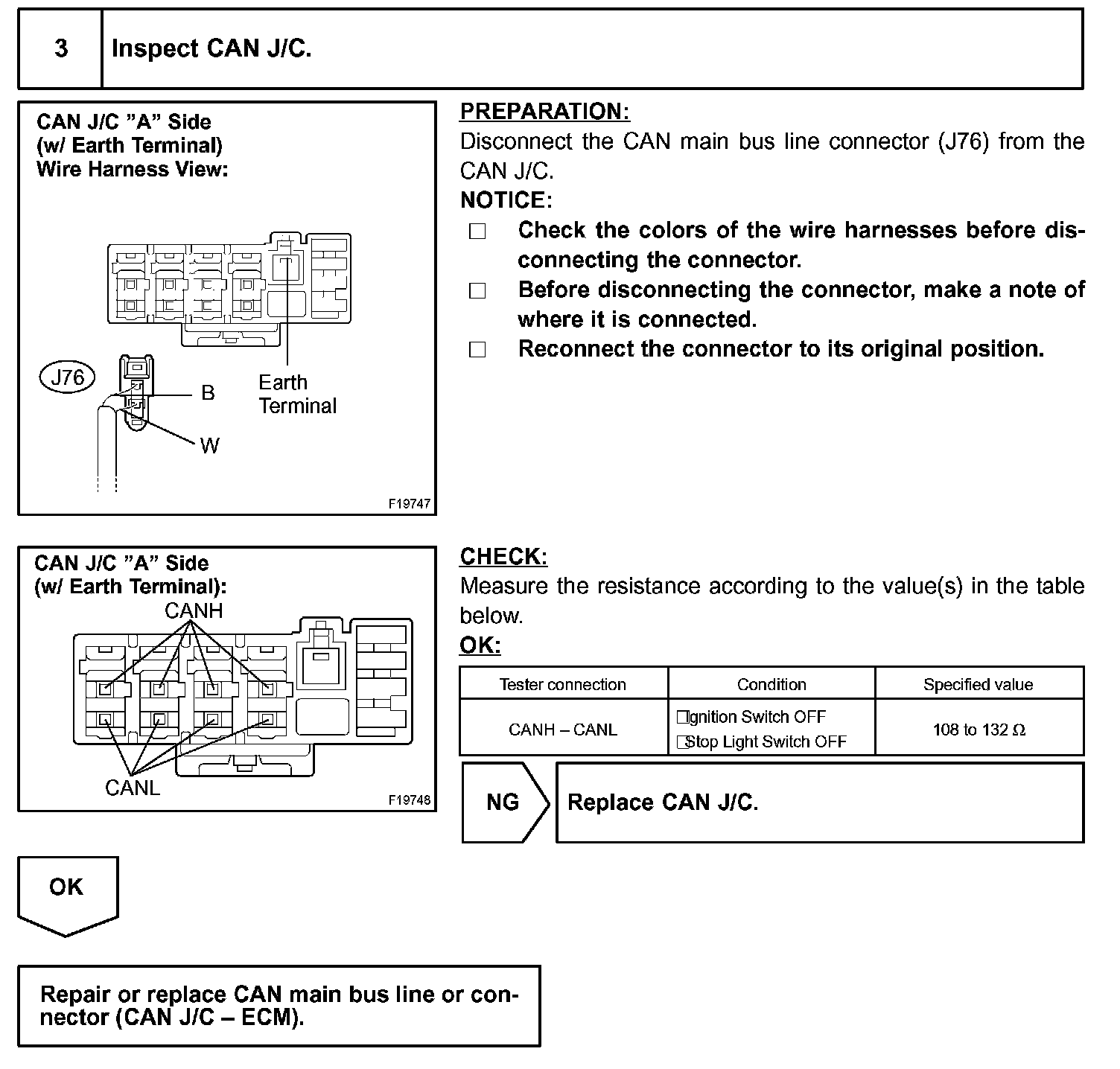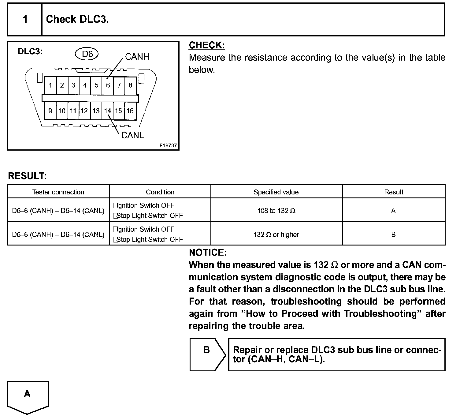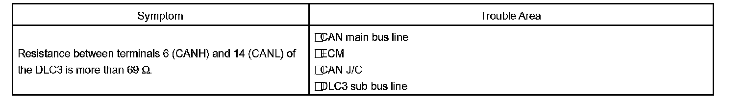 The CAN main bus line and DLC3 sub bus line may have a disconnection when the resistance between terminals 6 (CANH) and 14 (CANL) of the DLC3 is more than 69 Ohm.