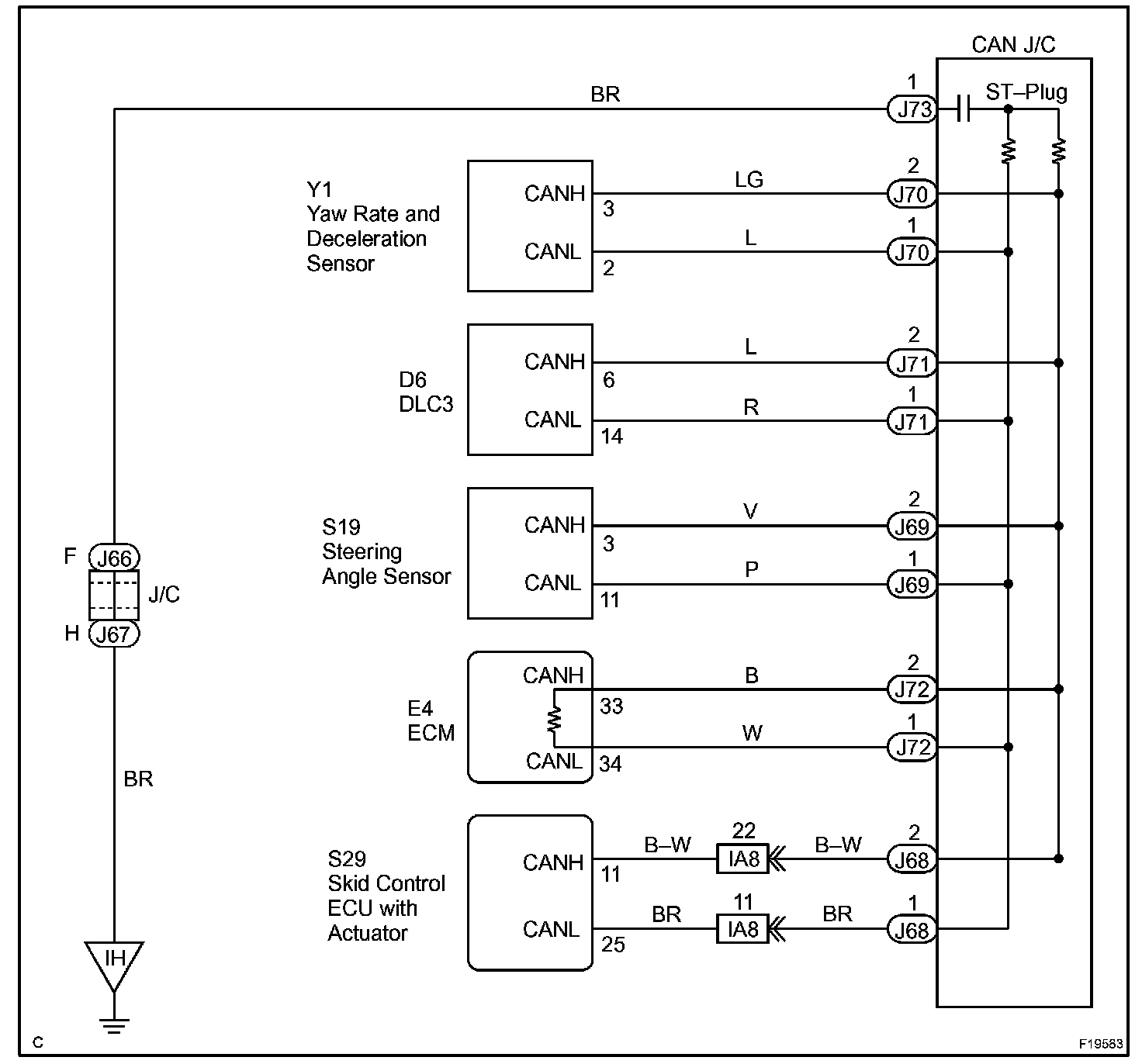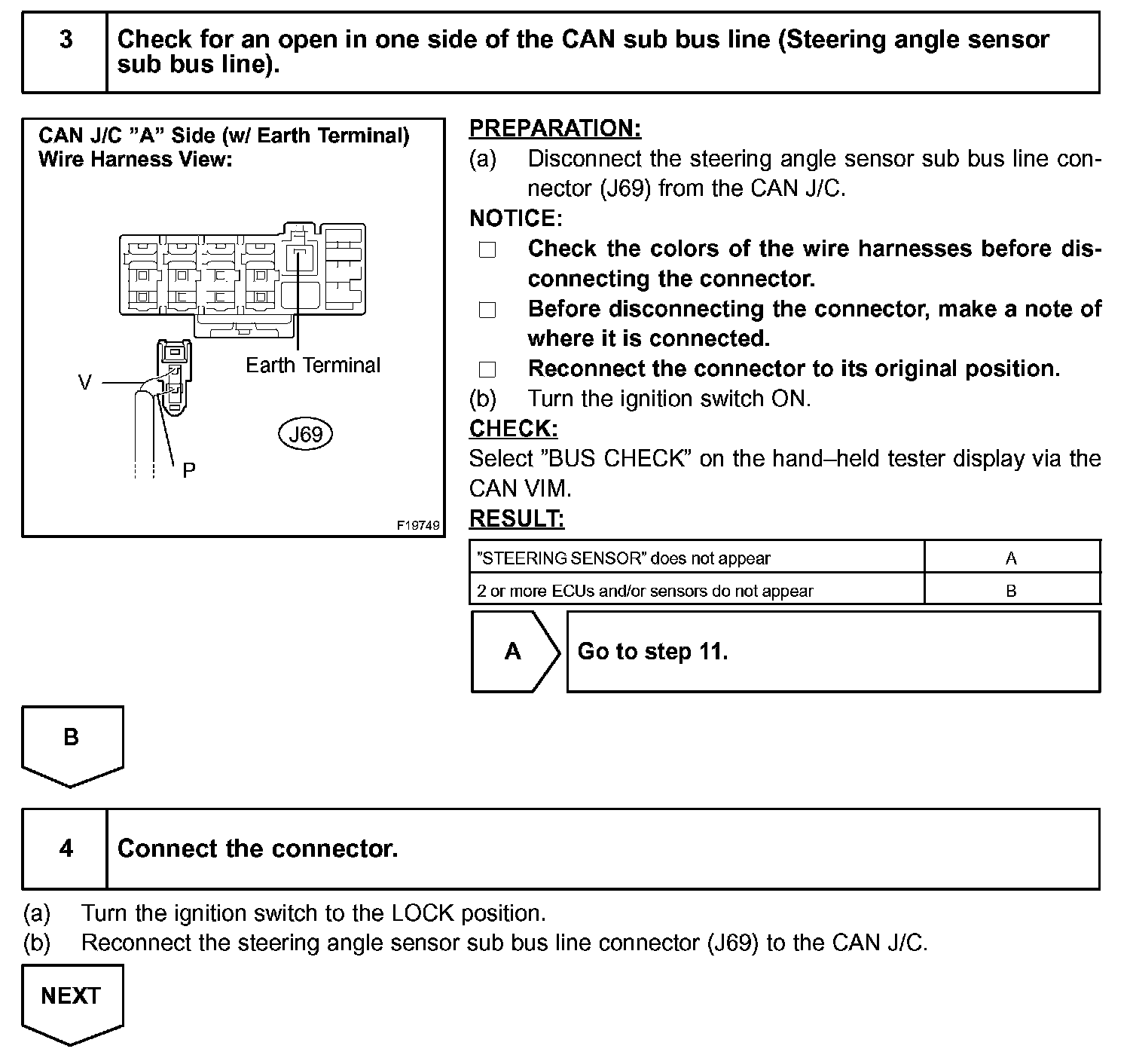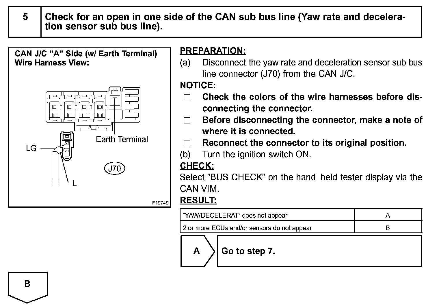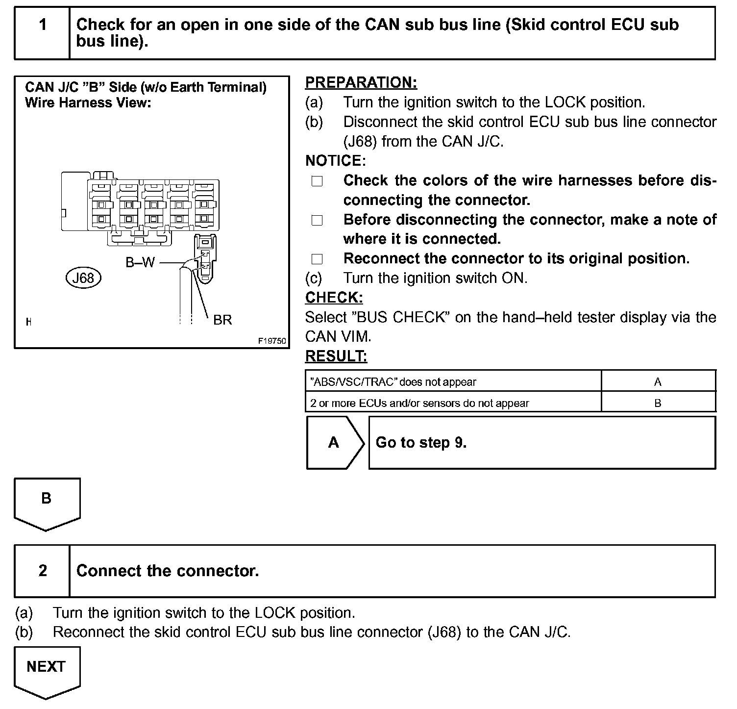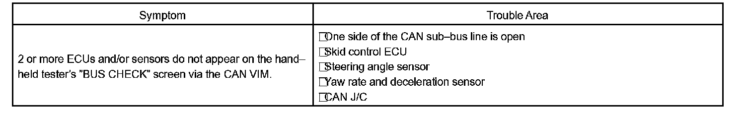 If 2 or more ECUs and/or sensors do not appear on the hand-held tester's "BUS CHECK" screen via the CAN VIM, one side of the CAN sub-bus line may be open. (One side of the CAN-H [sub-bus line] / CAN-L [sub-bus line] of the ECU and/or sensor is open.)