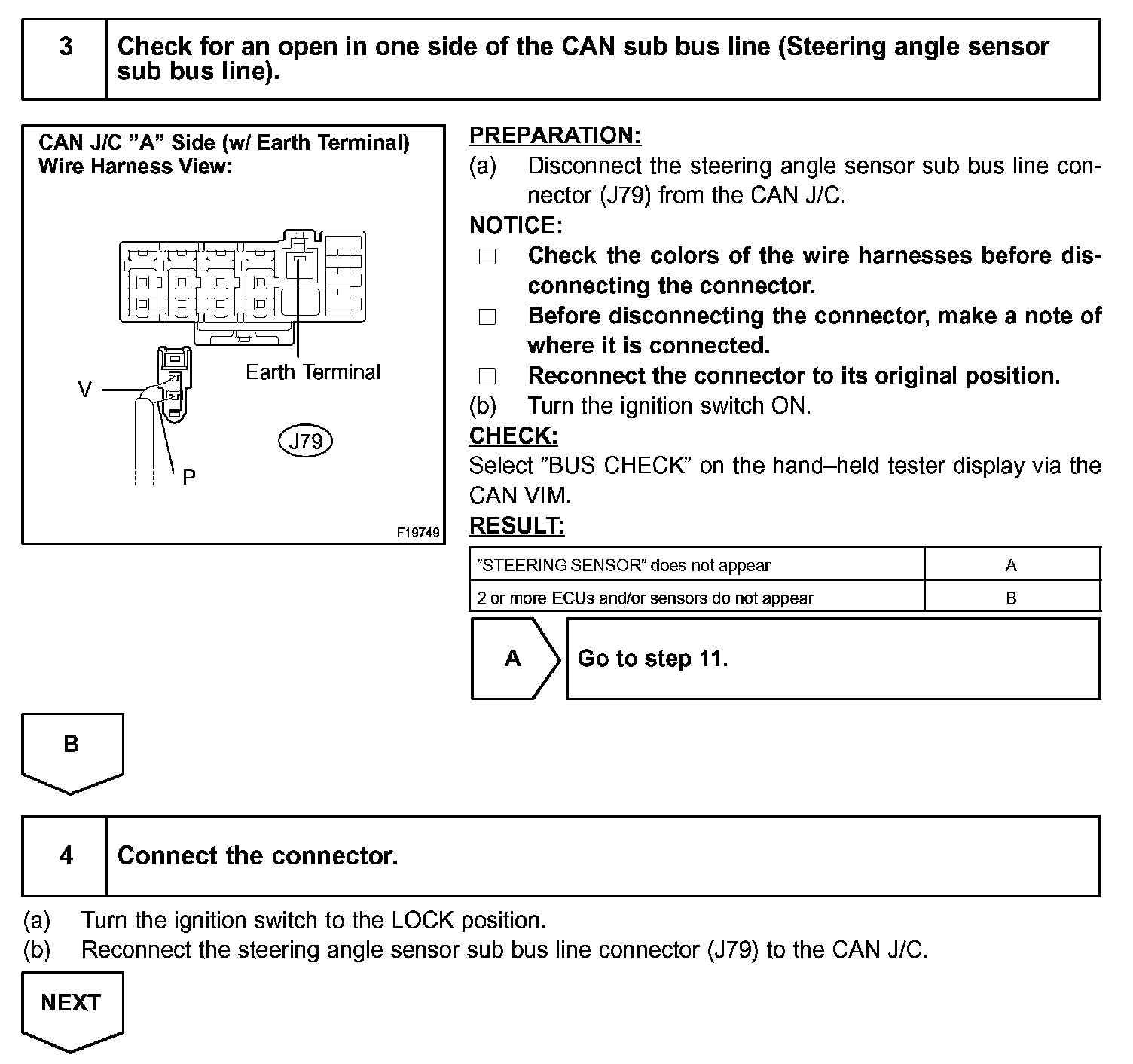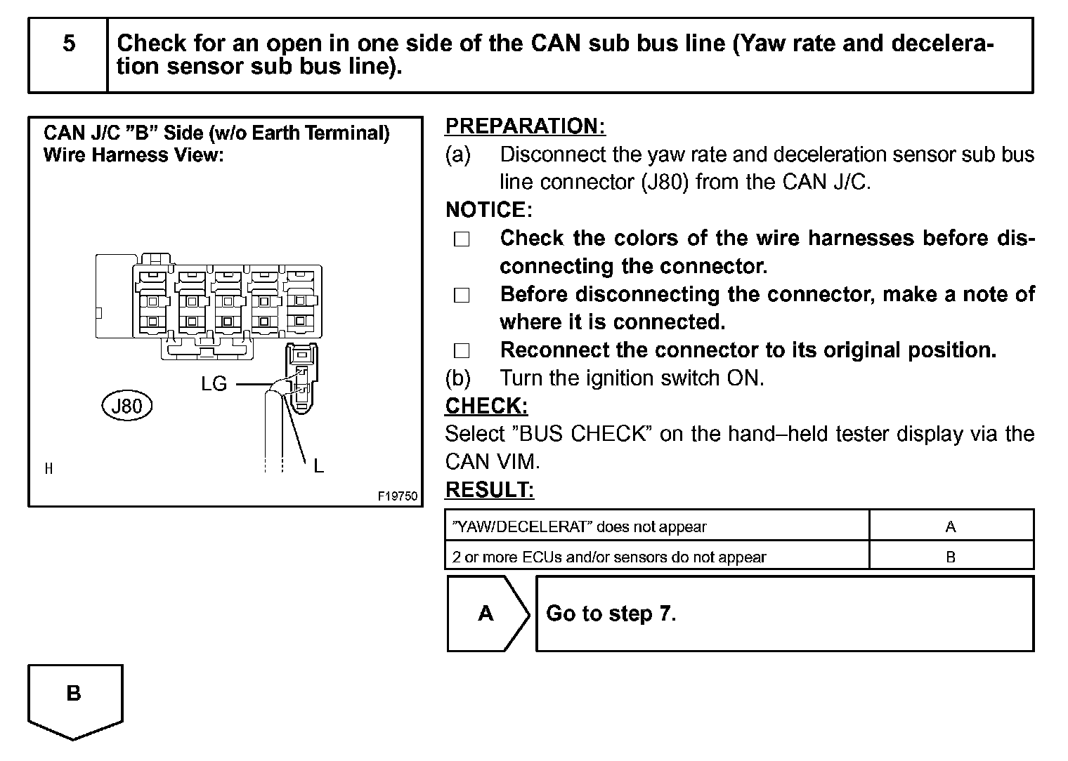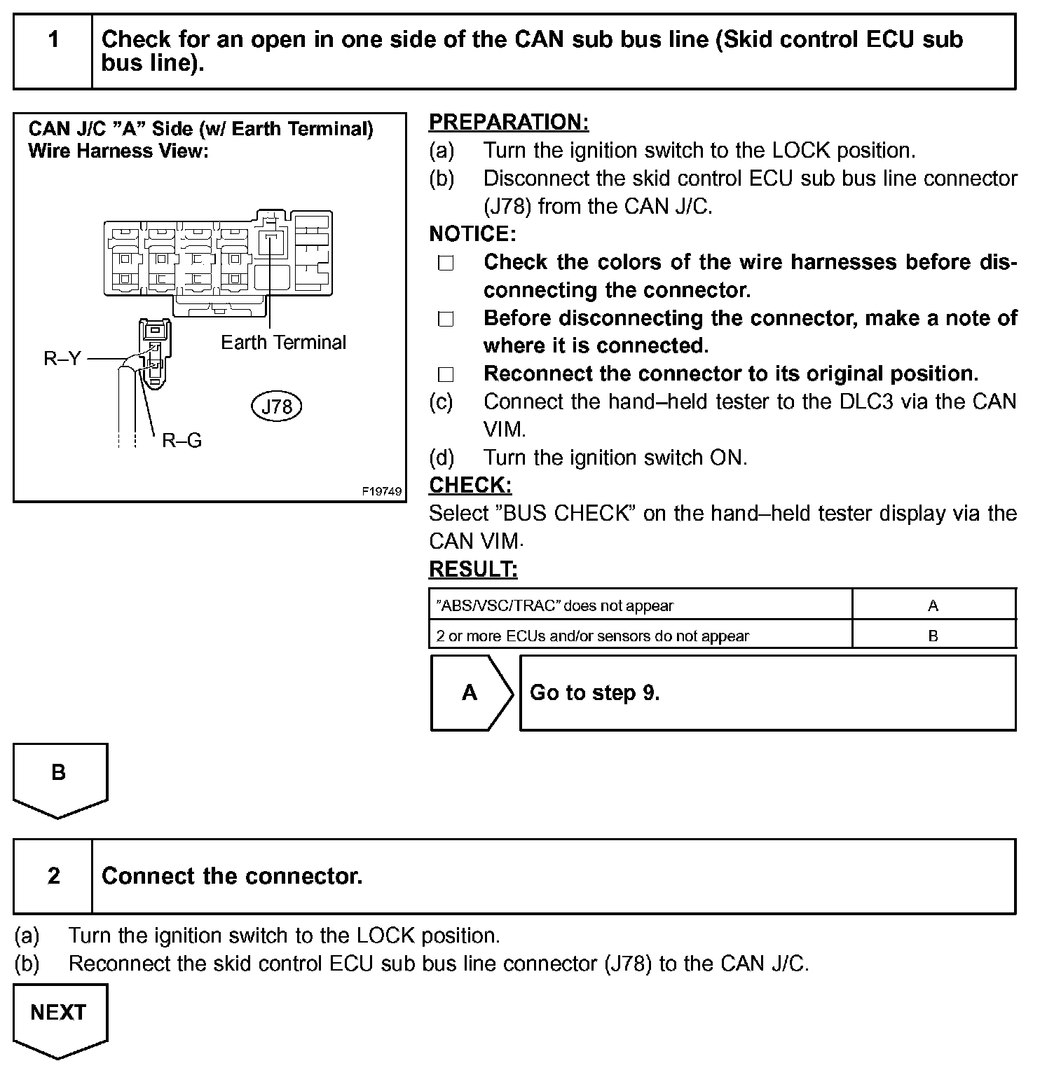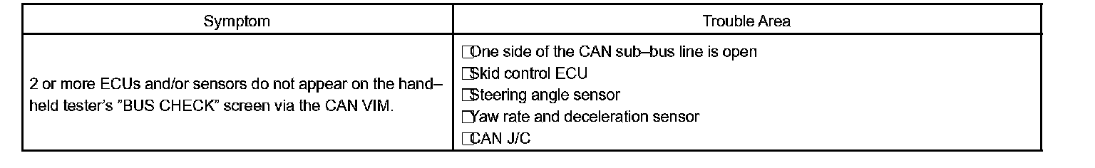 If 2 or more ECUs and/or sensors do not appear on the hand-held tester's "BUS CHECK" screen via the CAN VIM, one side of the CAN sub-bus line may be open. (One side of the CAN-H [sub-bus line] / CAN-L [sub-bus line] of the ECU and/or sensor is open.)