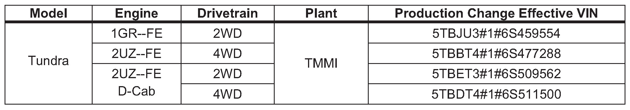 - 2005 - 2006 model year Tundra vehicles produced BEFORE the Production Change Effective VINs shown below.