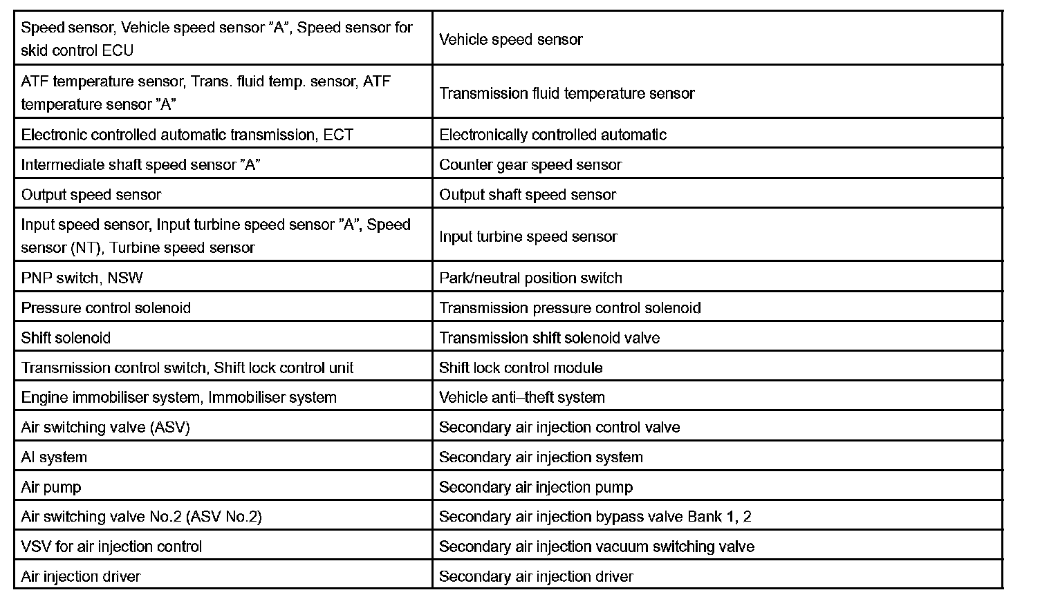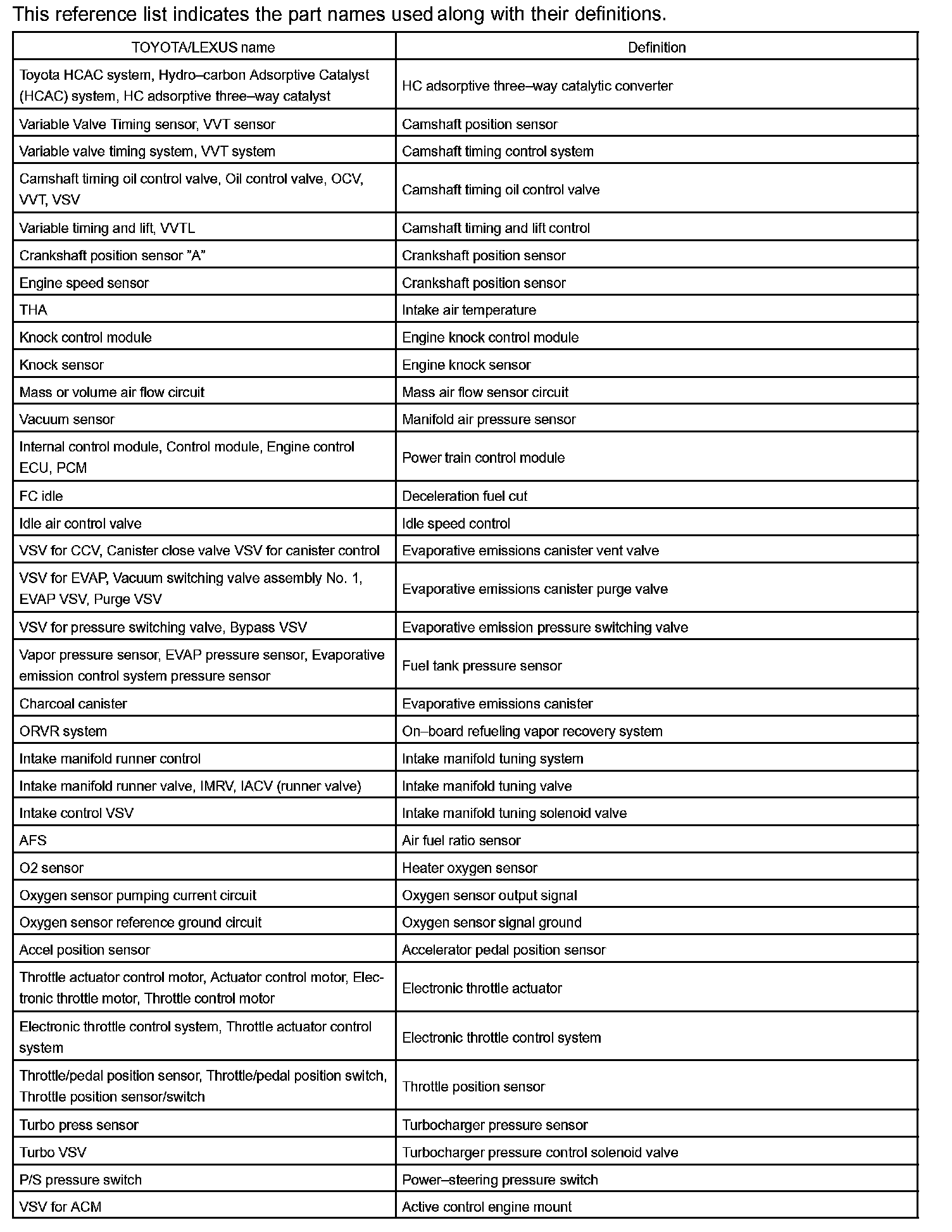 Toyota Part And System Name List Part 1: