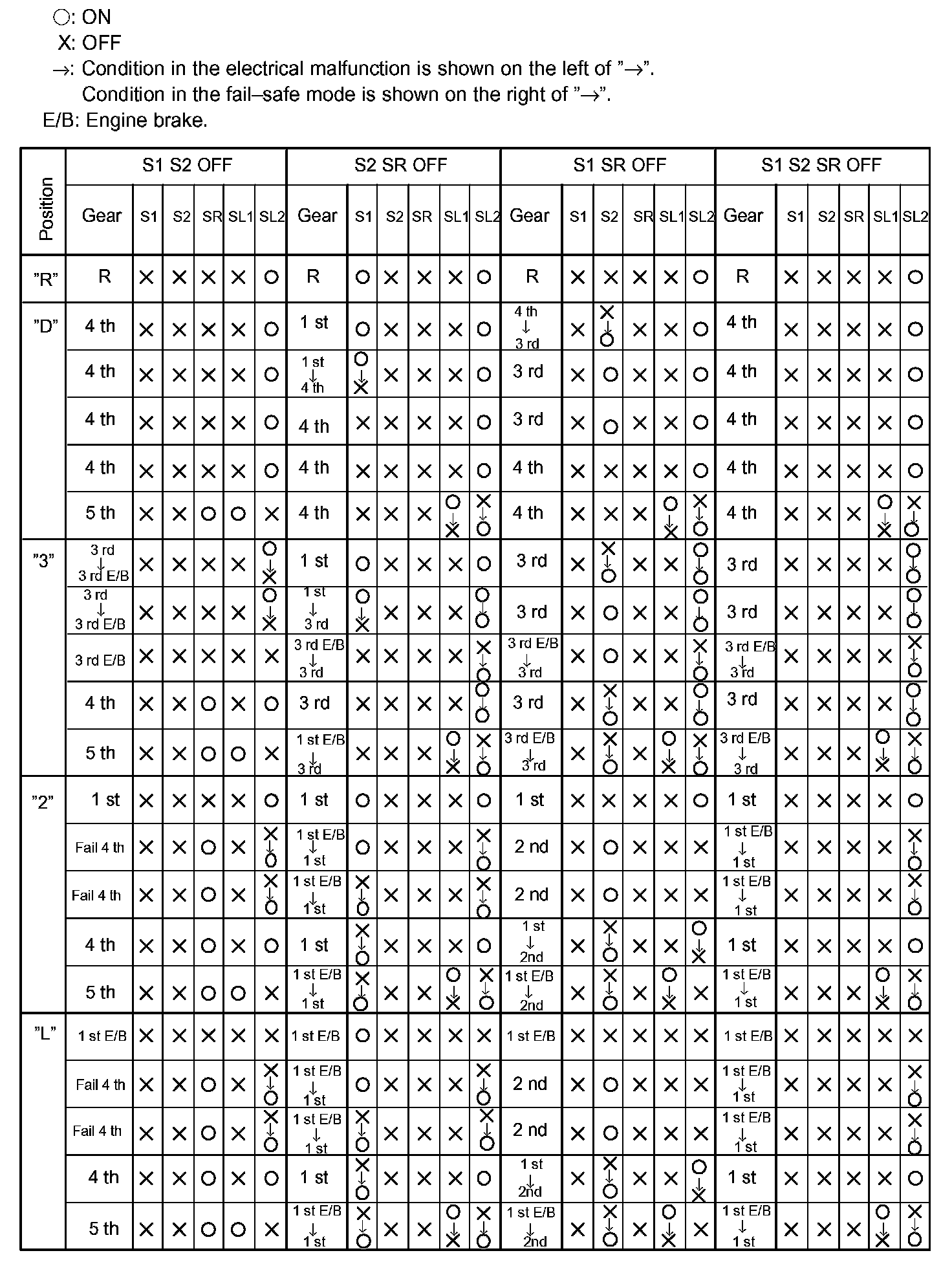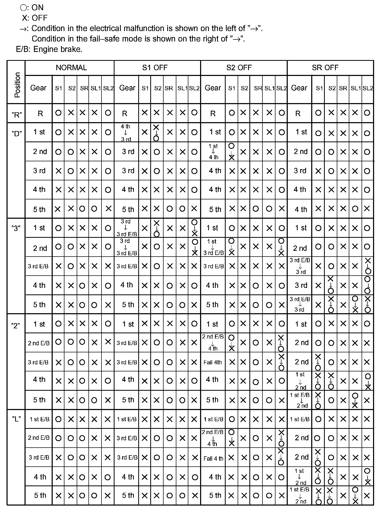 If either of the shift solenoid valve circuits has an open or short failure, the ECM turns the other shift solenoid "ON" and "OFF" in order to shift into the gear positions shown in the table.