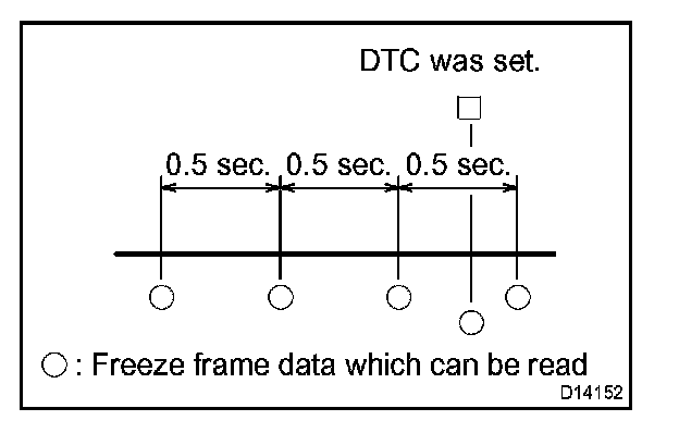 The hand-held tester records freeze frame data in five different instances: 1) 3 times before the DTC is set, 2) once when the DTC is set, and 3) once after the DTC is set. These data can be used to simulate the vehicle's condition around the time when the malfunction occurred. The data may help find the cause of the malfunction, or judge if the DTC is being caused by a temporary malfunction or not.