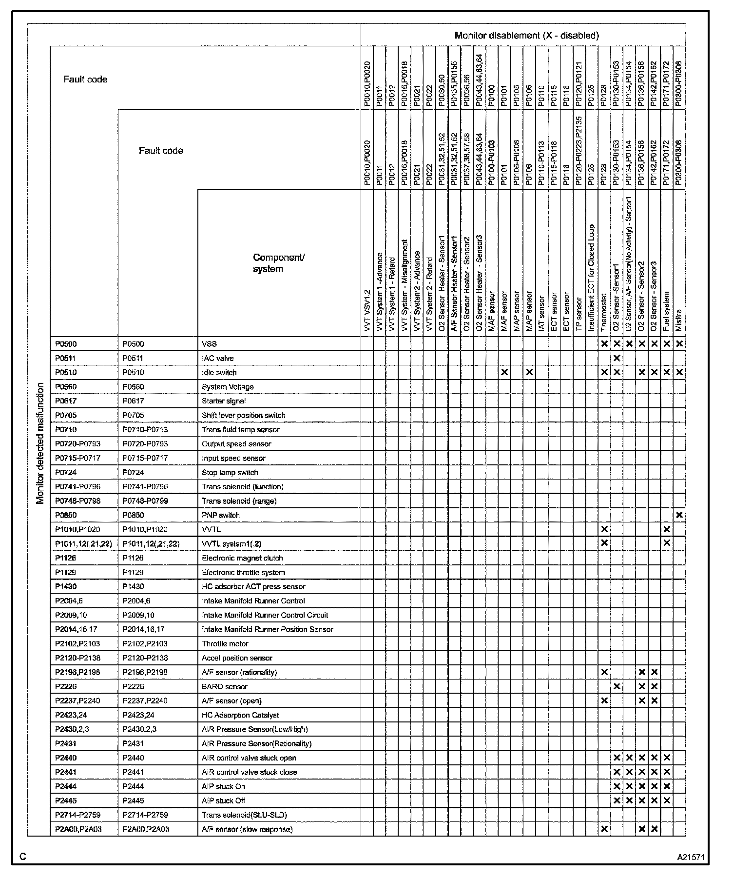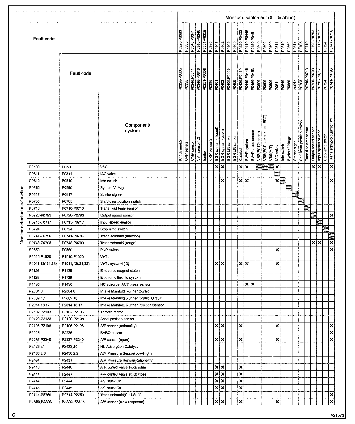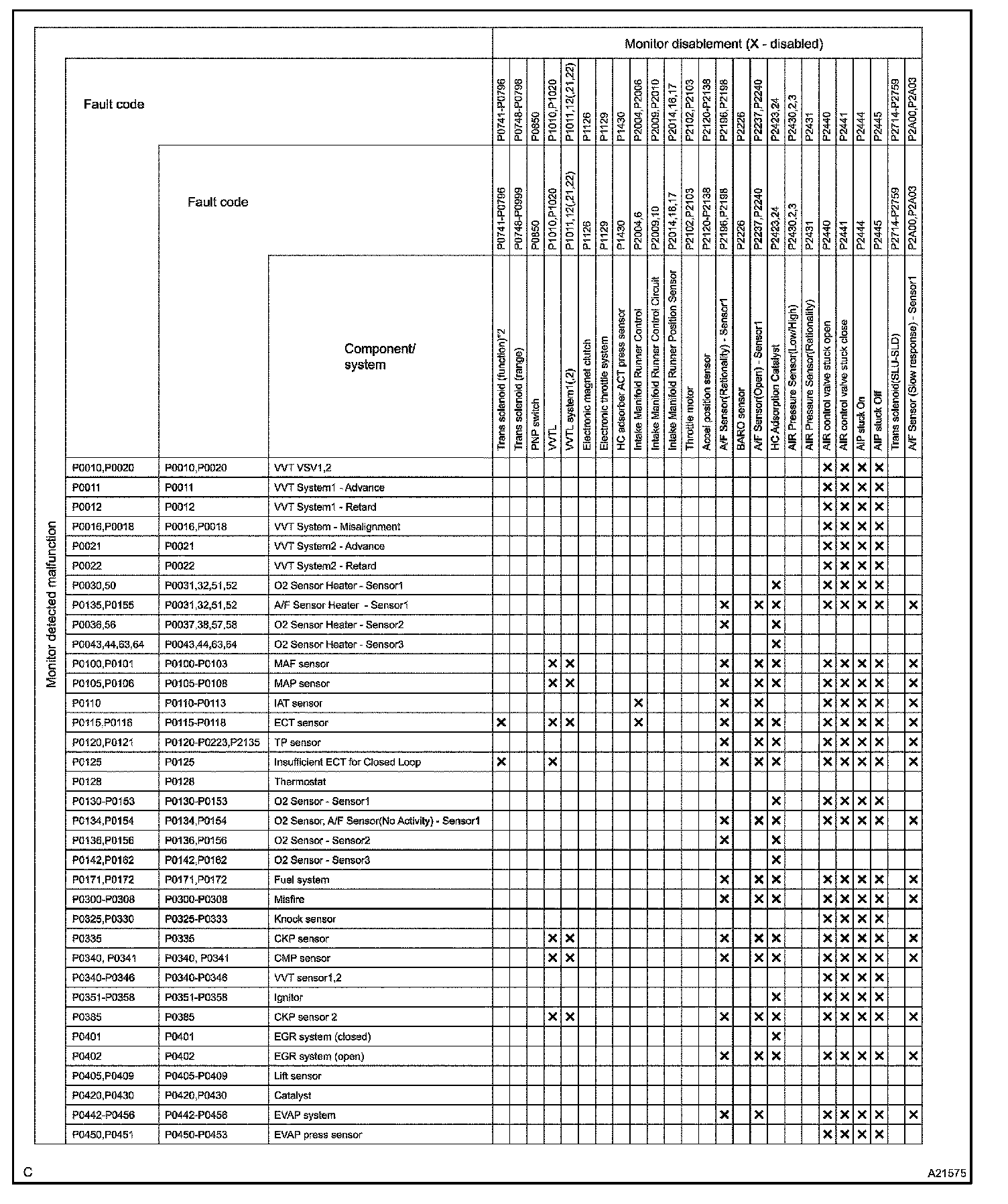 LIST OF DISABLE A MONITORHINT: This table indicates ECM monitoring status for the items in the upper columns if the DTCs in each line are being set.