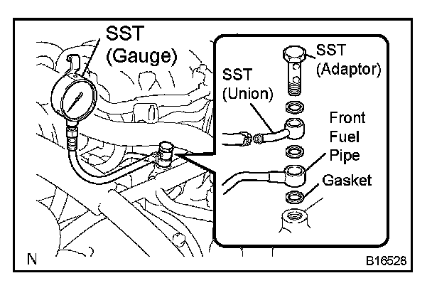d. Install the front fuel pipe and SST (pressure gauge) to the delivery pipe with 3 lower gaskets and SST (adaptor).