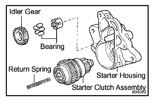 c. Remove the starter housing, return spring, idler gear, bearing and starter clutch assembly.
