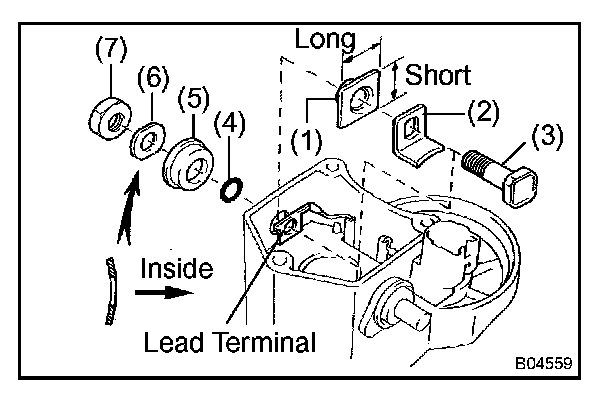 NOTE: Be careful to install the terminal insulator (inside) and wave washer in the correct direction.