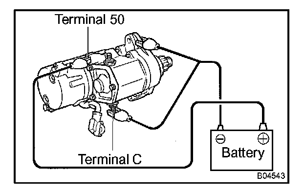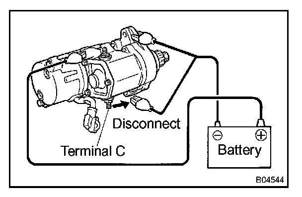 While connected as above with the pinion gear out, disconnect the negative (-) lead from terminal C. Check that the pinion gear remains out.