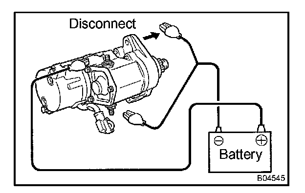 Disconnect the negative (-) lead from the starter body. Check that the pinion gear returns inward.