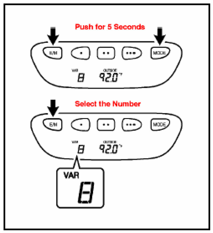 3. Push and hold the "MODE" and "E/M" buttons simultaneously for 5 seconds until the "VAR" indication appears on the compass display. Then, a zone number (1- 5) will appear on the compass display.
