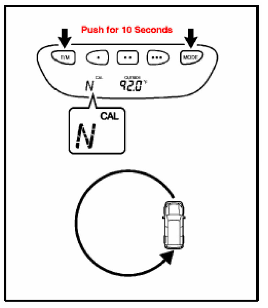 7. Push and hold the "MODE" and "E/M" buttons simultaneously for 10 seconds until the "CAL" indication appears on the compass display. At this time, the compass display is locked in "N".