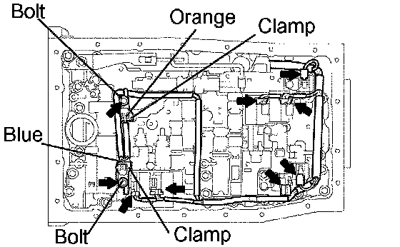 e. Install the 2 ATF temperature sensors and clamps to the valve body with the 2 bolts.