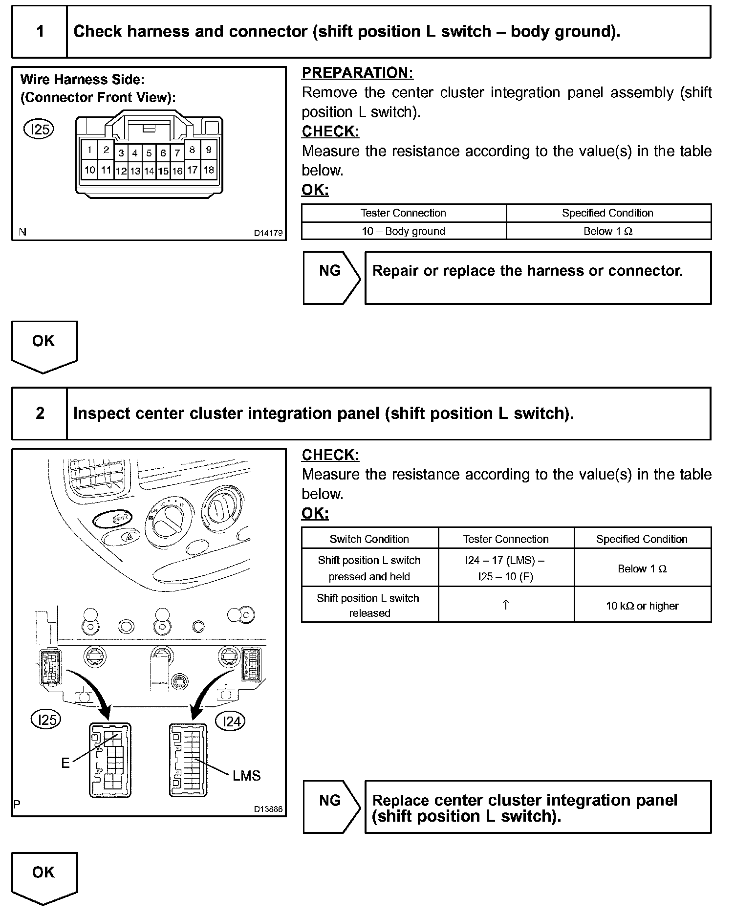 The shift position L switch is a momentary type switch. When the shift position L switch is pressed while driving with the shift lever in the 2 position, the L position indicator on the combination meter comes on and the transmission is locked in 1st gear. When the switch is pressed again, the indicator goes off and the transmission is released.
