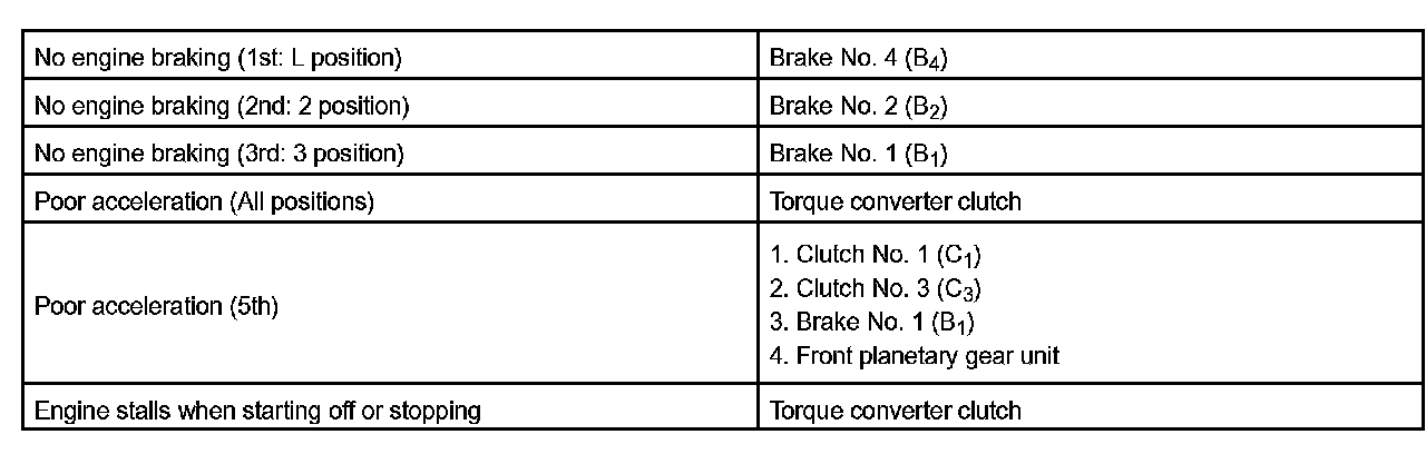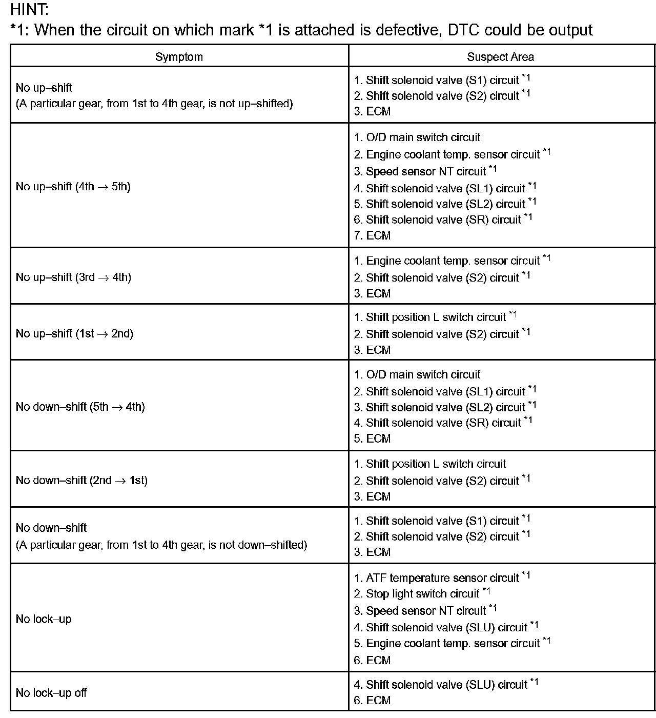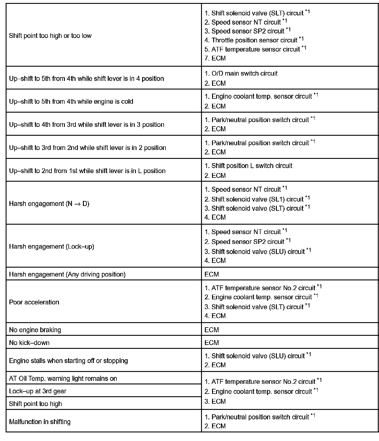 PROBLEM SYMPTOMS TABLEHINT: If a normal code is displayed during the diagnostic trouble code check although the trouble still occurs, check the electrical circuits for each symptom in the order given in the charts and proceed to the given for troubleshooting.