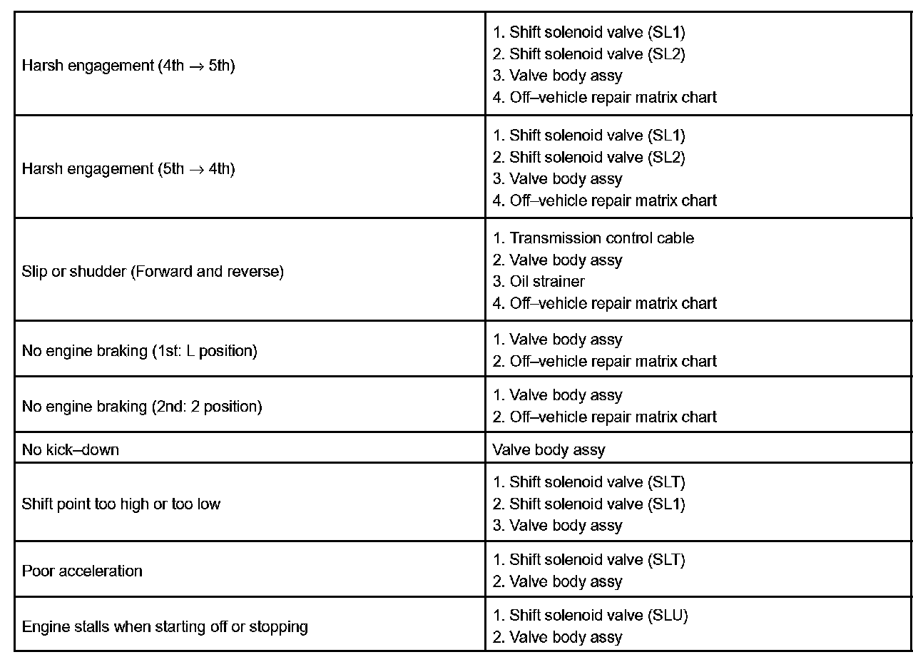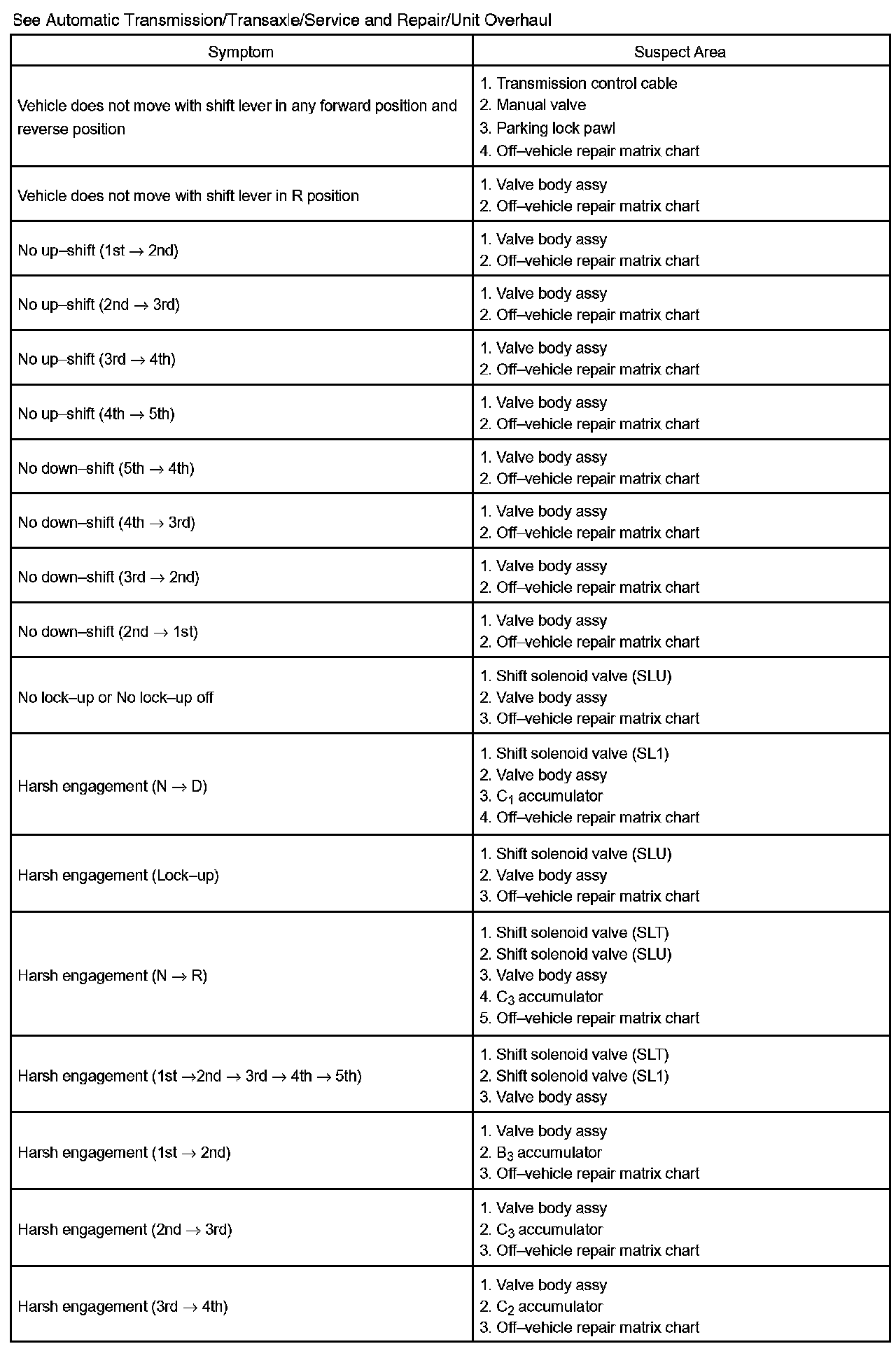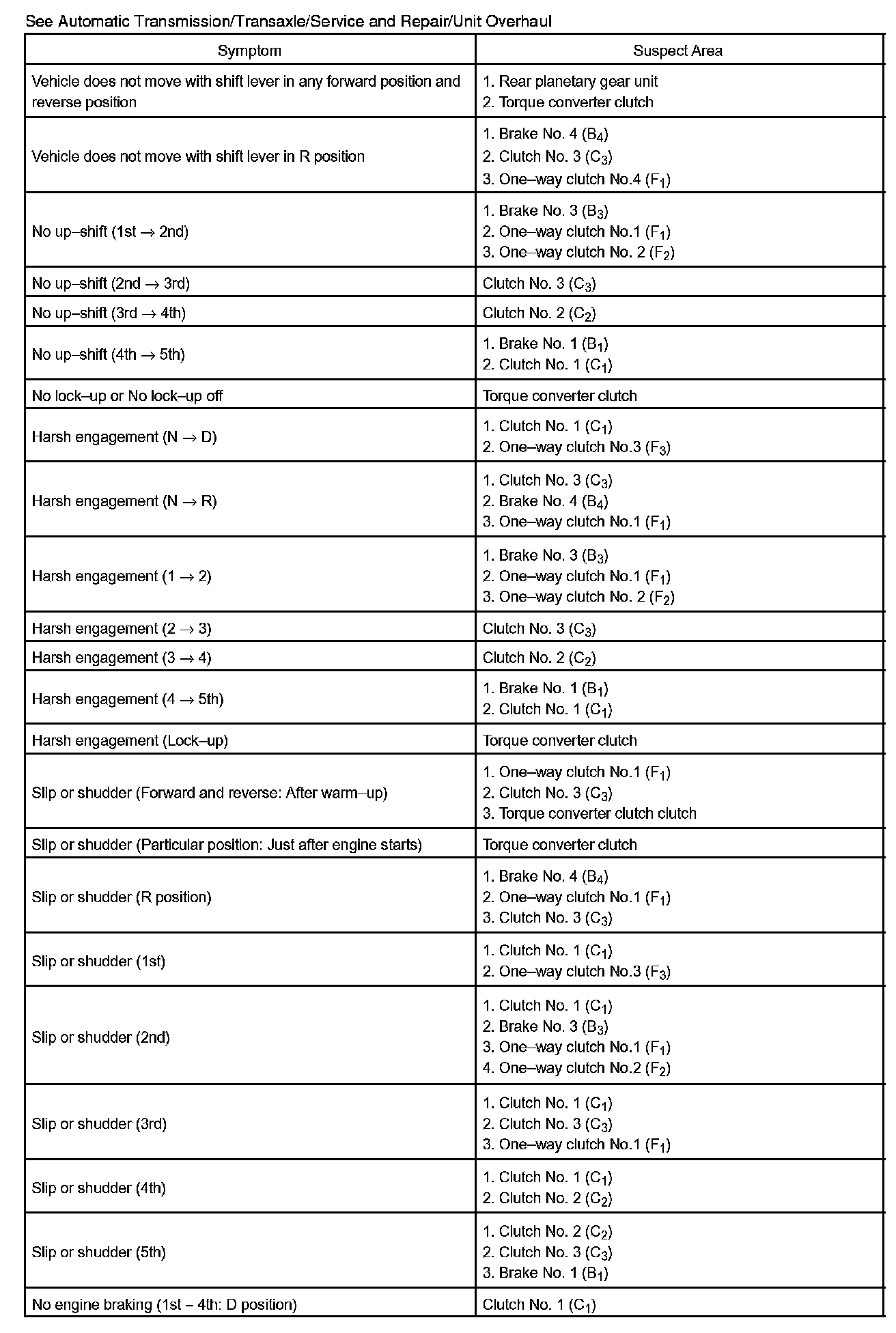 PROBLEM SYMPTOMS TABLEHINT: If a normal code is displayed during the diagnostic trouble code check although the trouble still occurs, check the electrical circuits for each symptom in the order given in the charts and proceed to the given for troubleshooting.