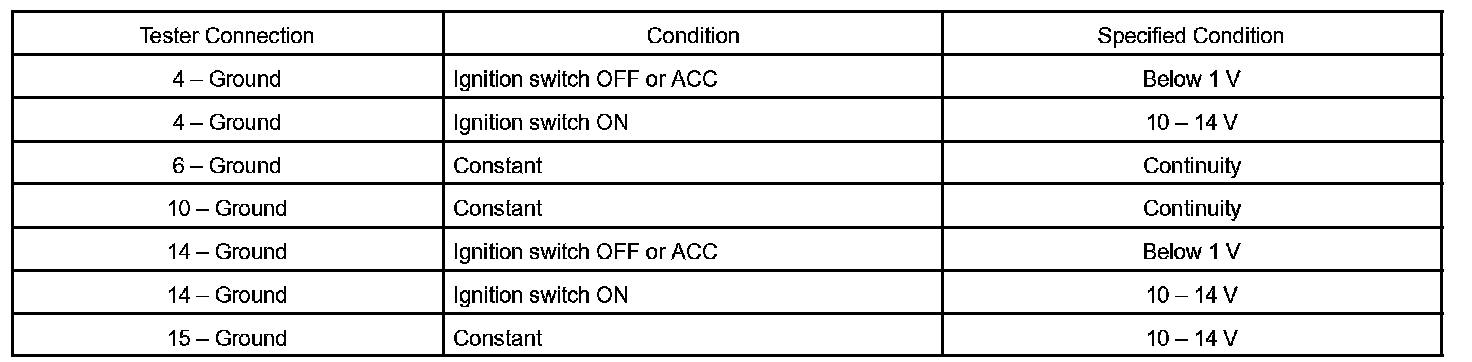 Disconnect the connector from the panel and inspect the connector on wire harness side, as shown in the chart.