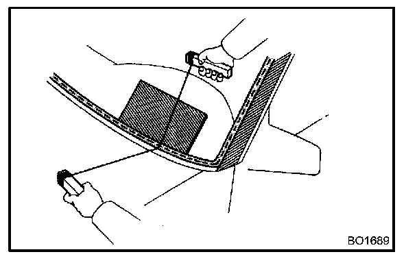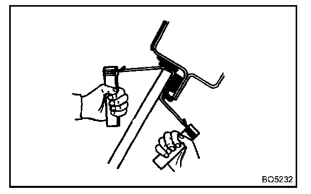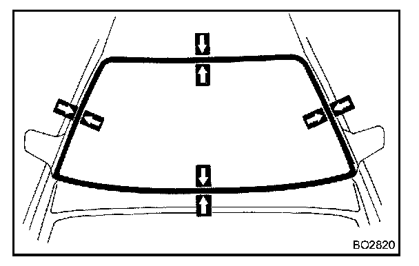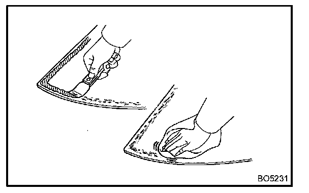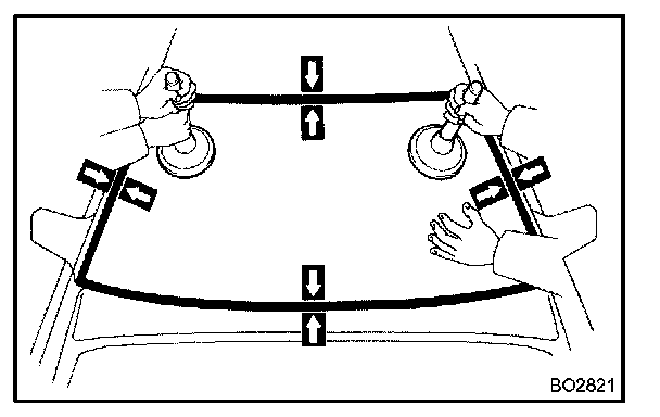NOTE: When separating the glass, take care not to damage the paint and exterior ornaments. To prevent scratching the safety pad when removing the windshield, place a plastic sheet between the piano wire and safety pad.