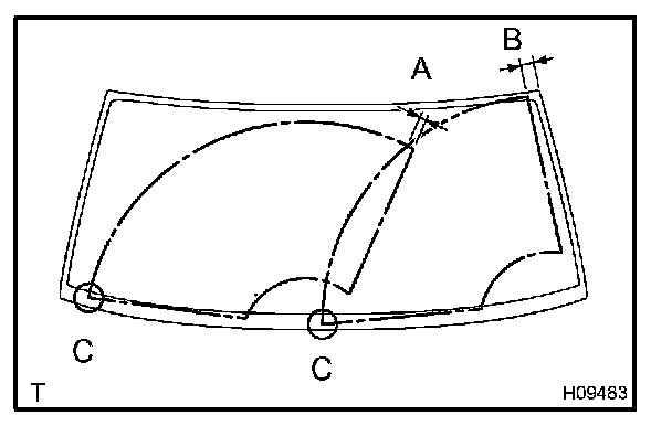 HINT: When installing wiper arms, make sure that the tips of the blades are not beyond the ceramic edge as indicated by "C" part in the illustration.