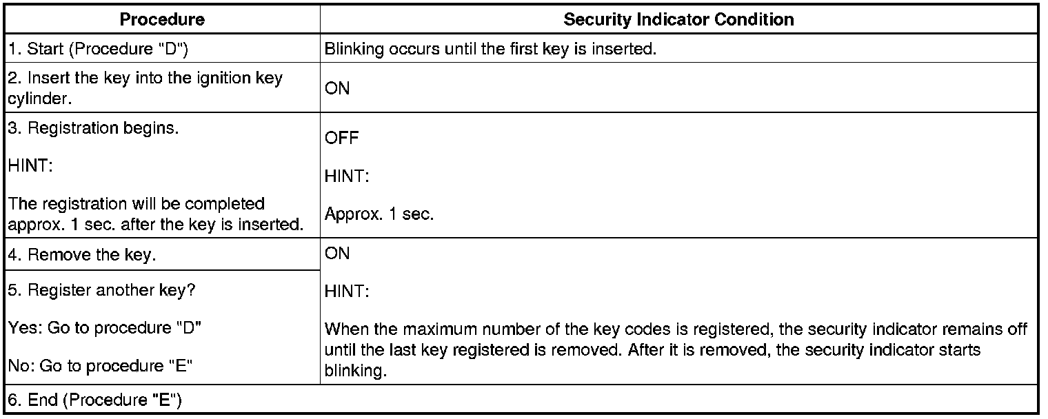 NOTICE: If the key code registration has failed in automatic key code registration mode, code 2-1 will be output from the security indicator. Trying to register an already registered key will cause code 2-2 to be output when the key is inserted. If the number of registered key codes exceeds the limit, code 2-3 will be output from the security indicator. The output details are shown in procedure "B".