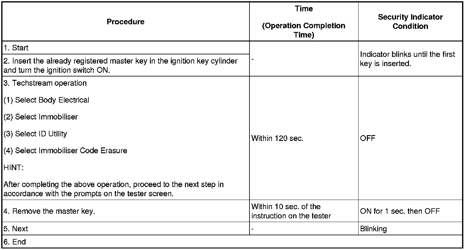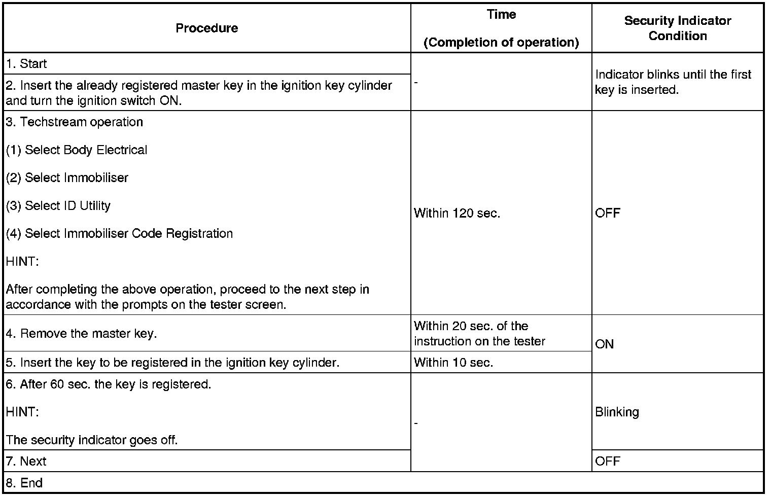 - A brief outline of procedures for key code registration is shown above. For detailed information, please refer to the screen of the Techstream.