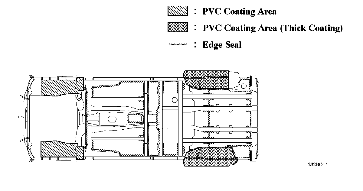 PVC (Polyvinyl Chloride) coating is applied to the under side of the body. The fender apron and other parts, which are subject to damage by flying stones, etc., are given a thick coating to improve rust-resistant performance.