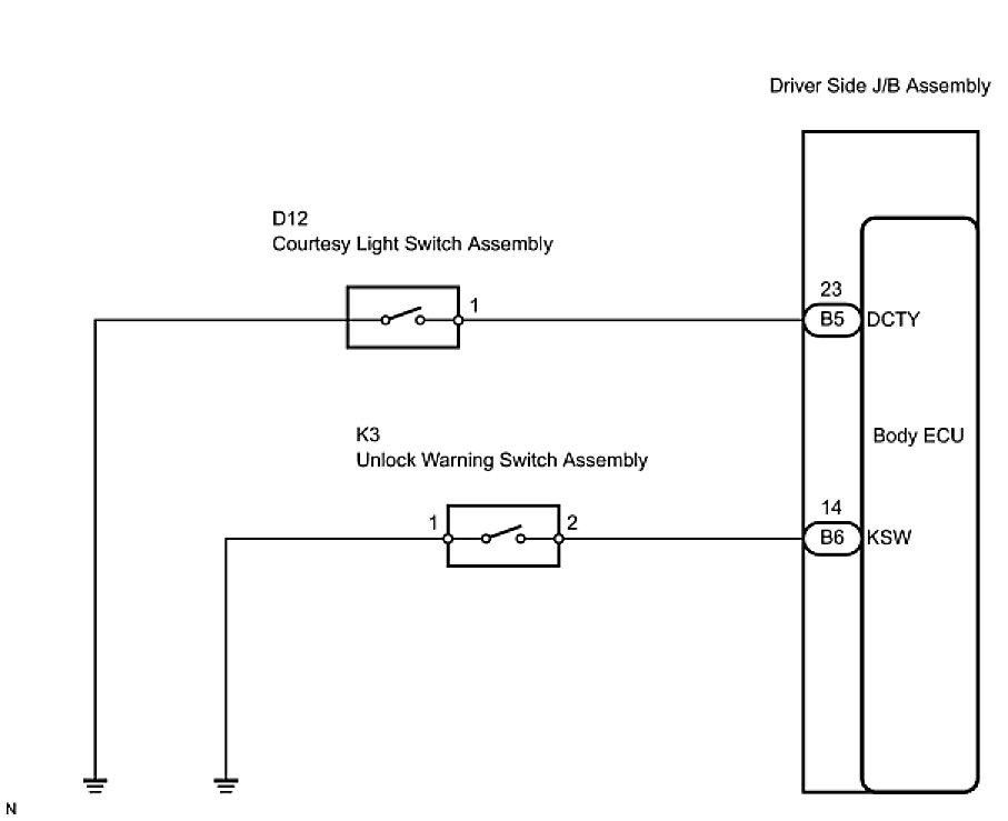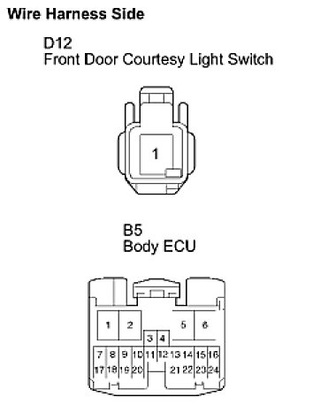 (b) Check the continuity between the terminals of the courtesy light switch (D12) and body ECU (B5) connectors.