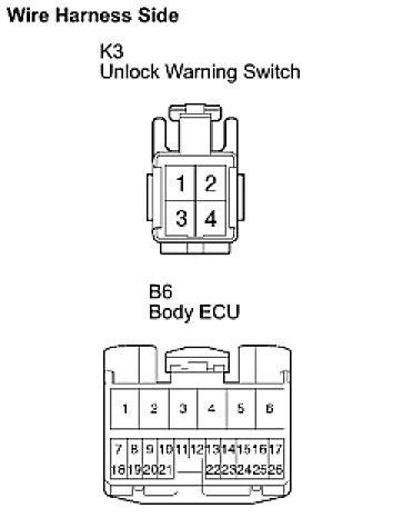 (b) Check the continuity between the terminals of the unlock warning switch (K3) and body ECU (B6) connectors.